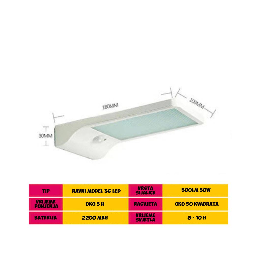 Reflektor ima model ravnog reflektora, koji osigurava da je svjetlost usmjerena tačno tamo gdje vam je potrebna. Napaja ga baterija od 2200mAH, koja se pomoću solarne energije može napuniti za samo 5 sati. 36 LED sijalica pružaju snagu od 500LM i 50W, osiguravajući da vaš vanjski prostor bude dobro osvijetljen u svakom trenutku.