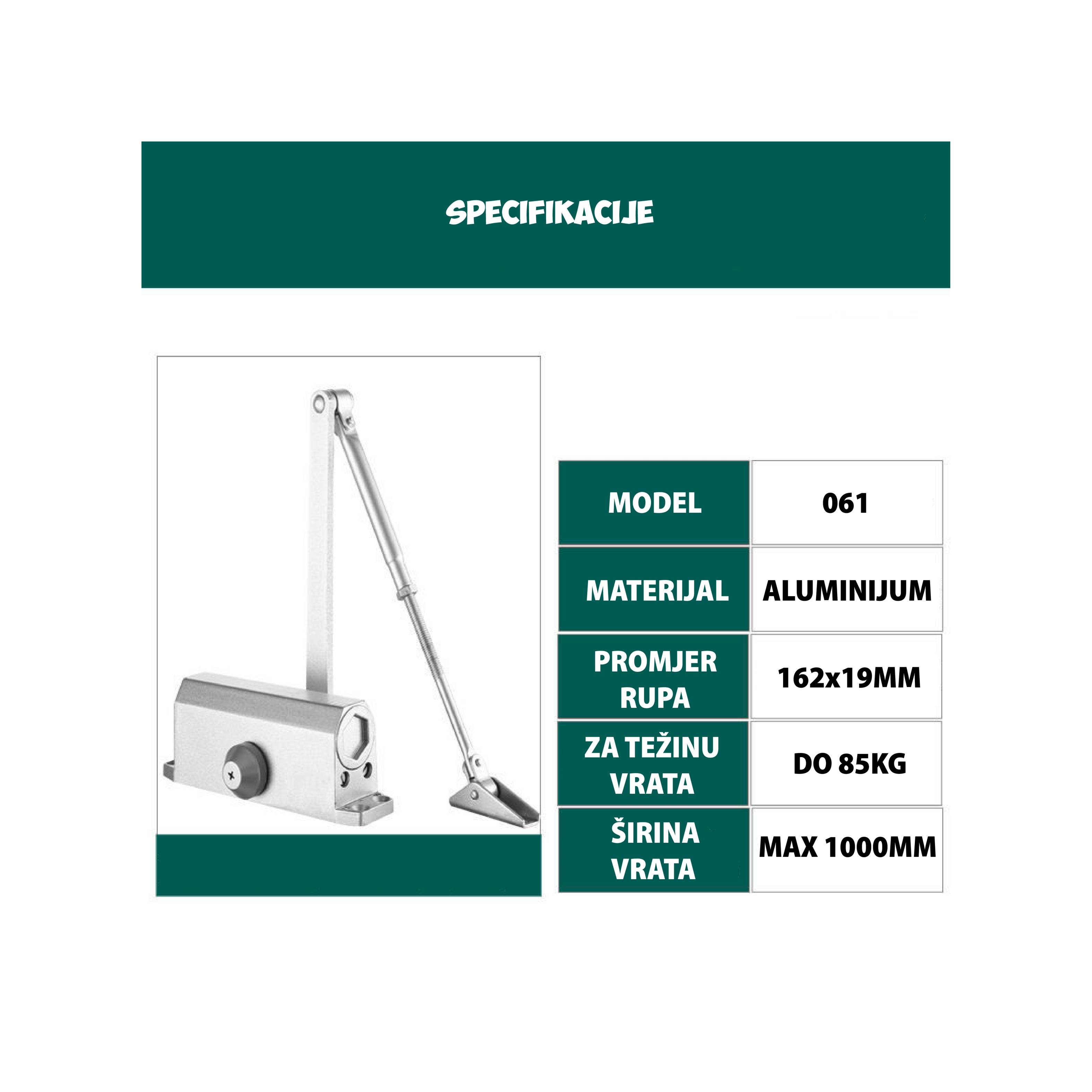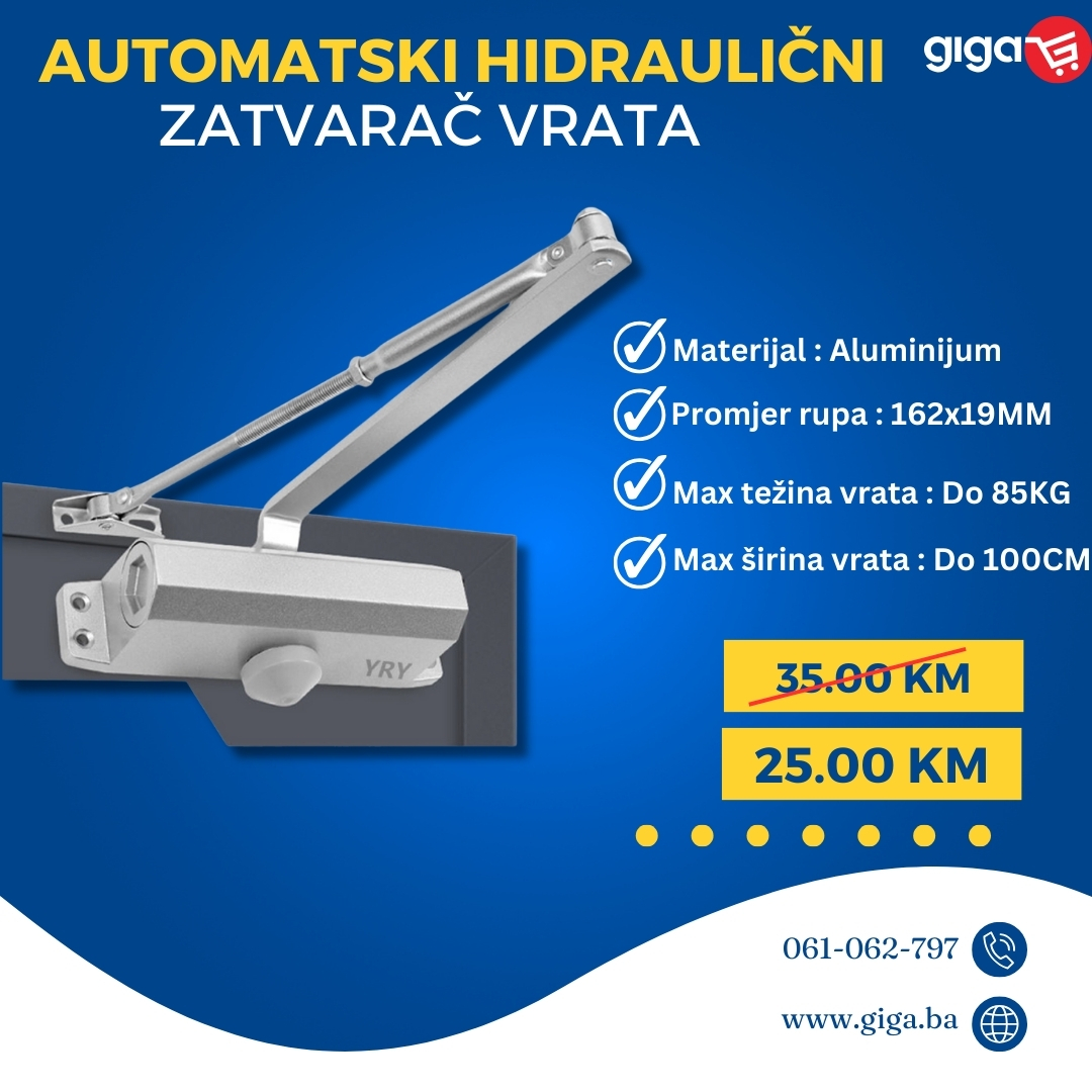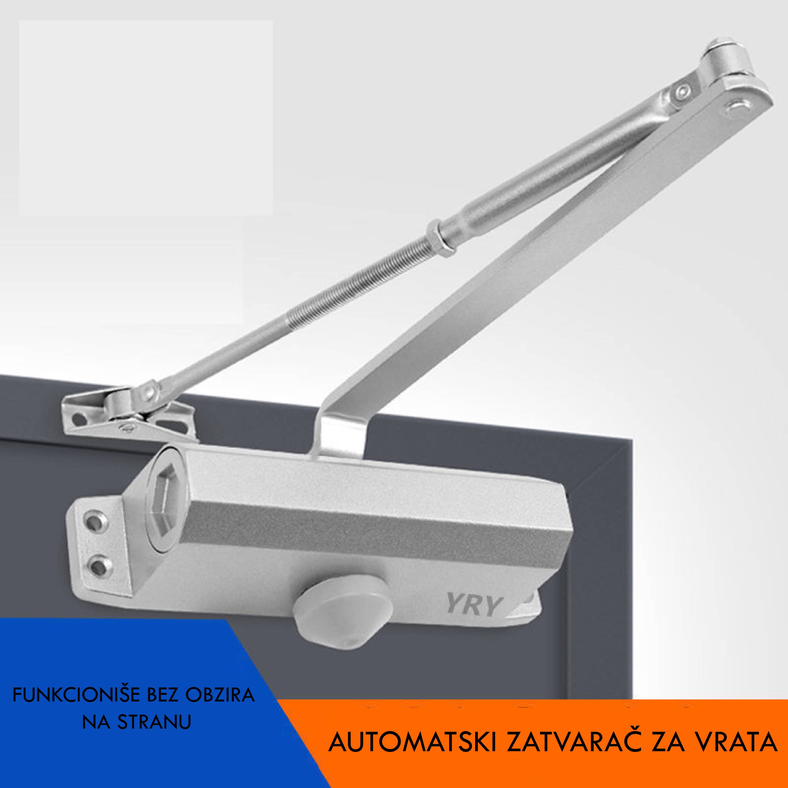 Ovaj automatski zatvarač vrata radi na principu hidraulične sile, što znači da se vrata zatvaraju polako i kontrolisano, bez naglog zatvaranja koje može oštetiti vrata ili okvir.
