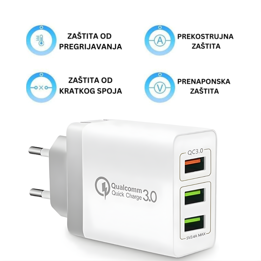 Qualcomm brzi punjač 3.0 sa 3 ulaza je vrhunski dodatak vašem elektronskom ekosistemu koji vam omogućava istovremeno punjenje tri uređaja visokom brzinom.