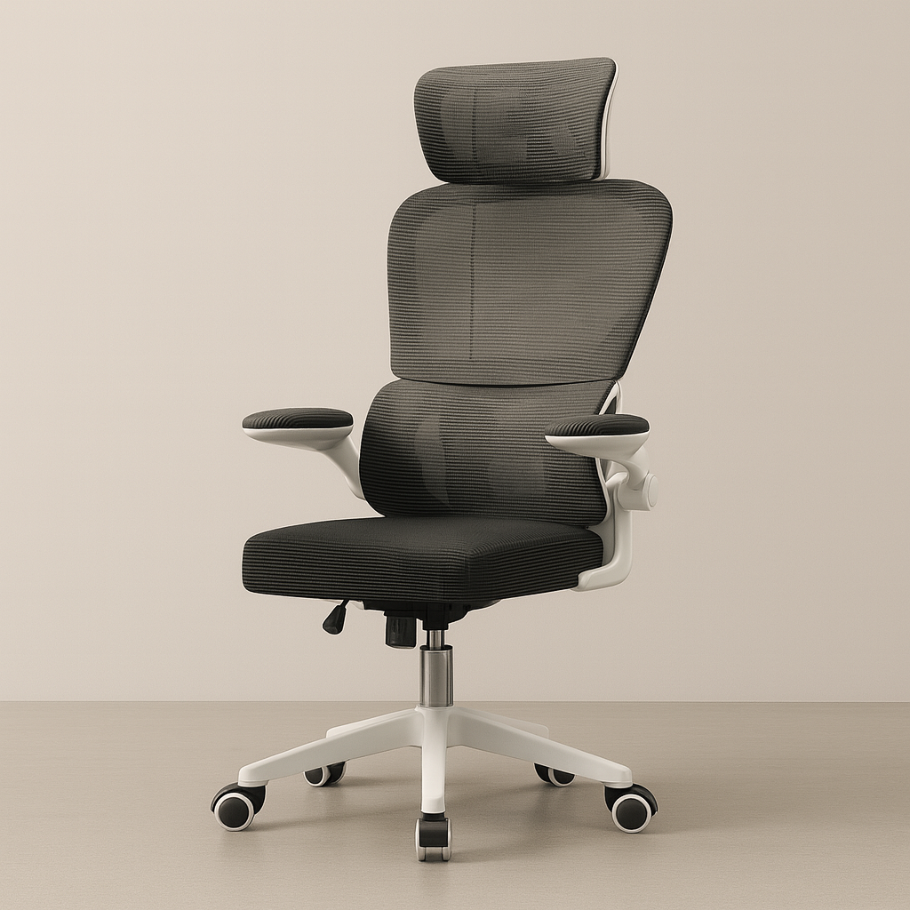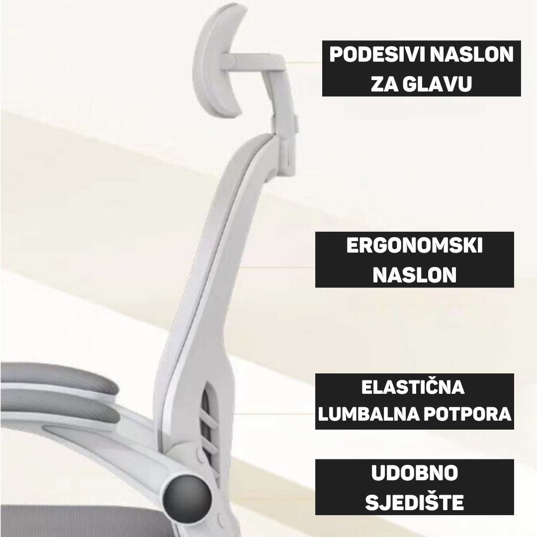 Podesivi naslon za glavu i ruke pružaju personaliziranu podršku, dok prozračna mreža omogućava udobnost tokom cijelog radnog dana.