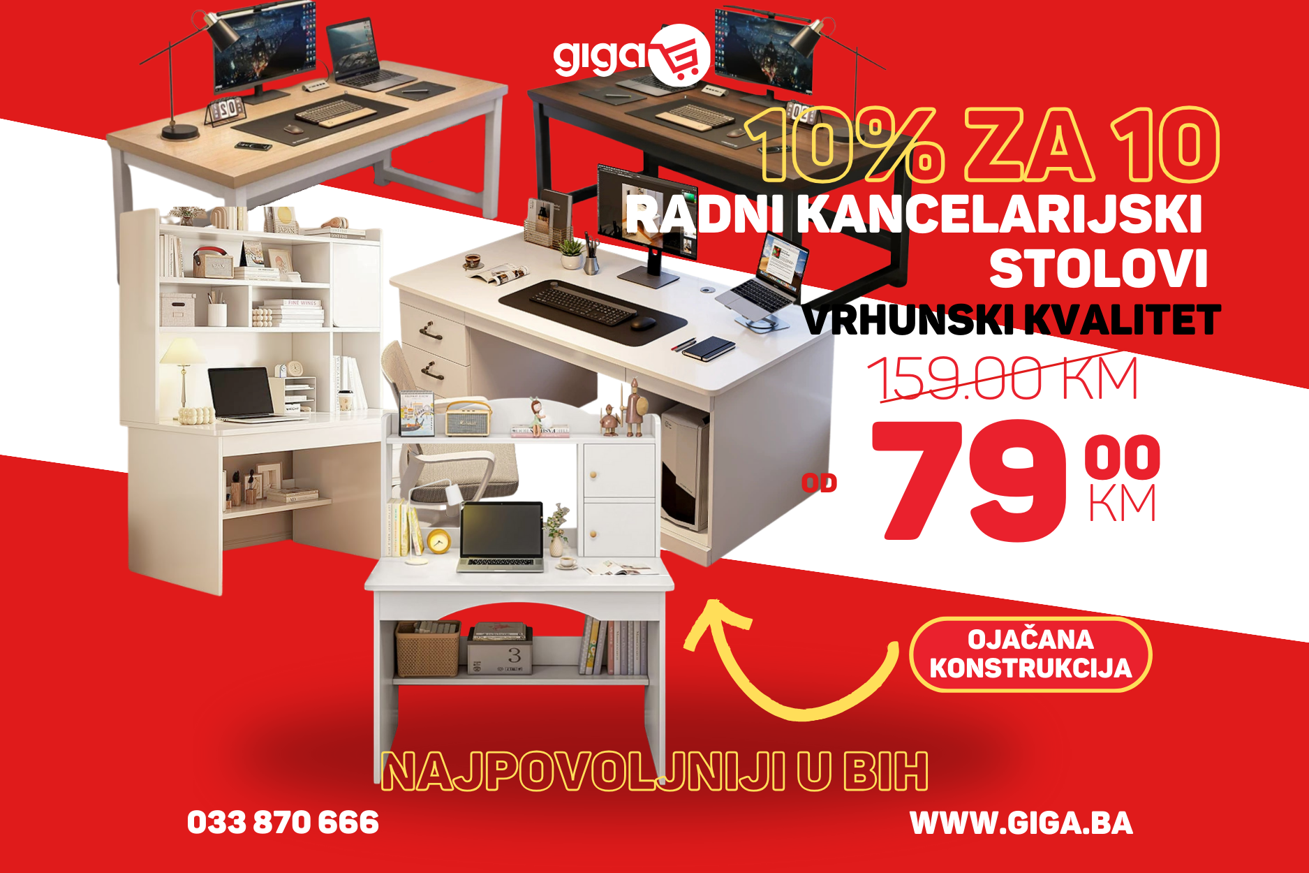 Bilo da radite od kuće ili u kancelariji, naši stolovi su prilagođeni vašim potrebama, nudeći dugotrajan kvalitet i udobnost pri radu. Odaberite model koji najbolje odgovara vašem prostoru i unaprijedite produktivnost uz vrhunski dizajn