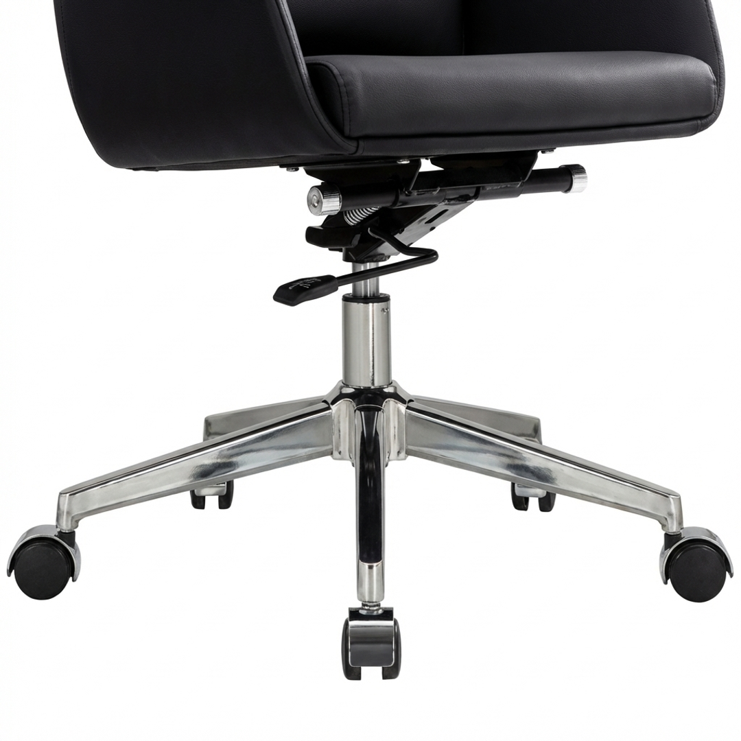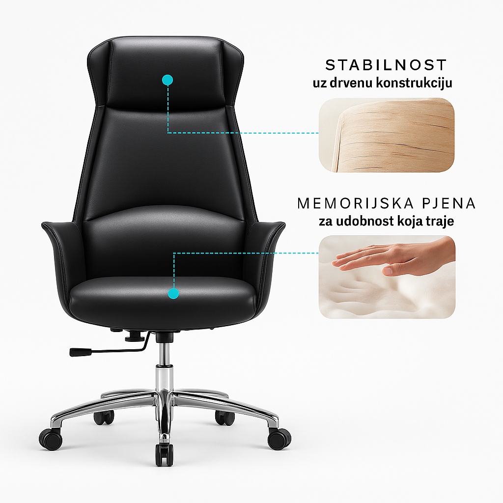 Baza od poliranog hroma ne samo da izgleda moderno, već pruža čvrstu potporu i izdržljivost do 150 kg nosivosti. Gumirani točkići omogućavaju tiho i glatko kretanje po svim vrstama podova, bez oštećenja.