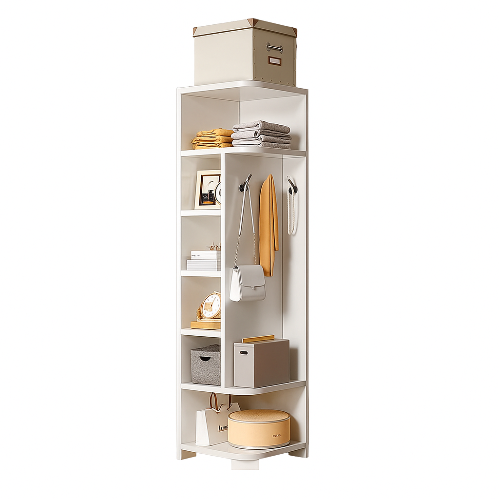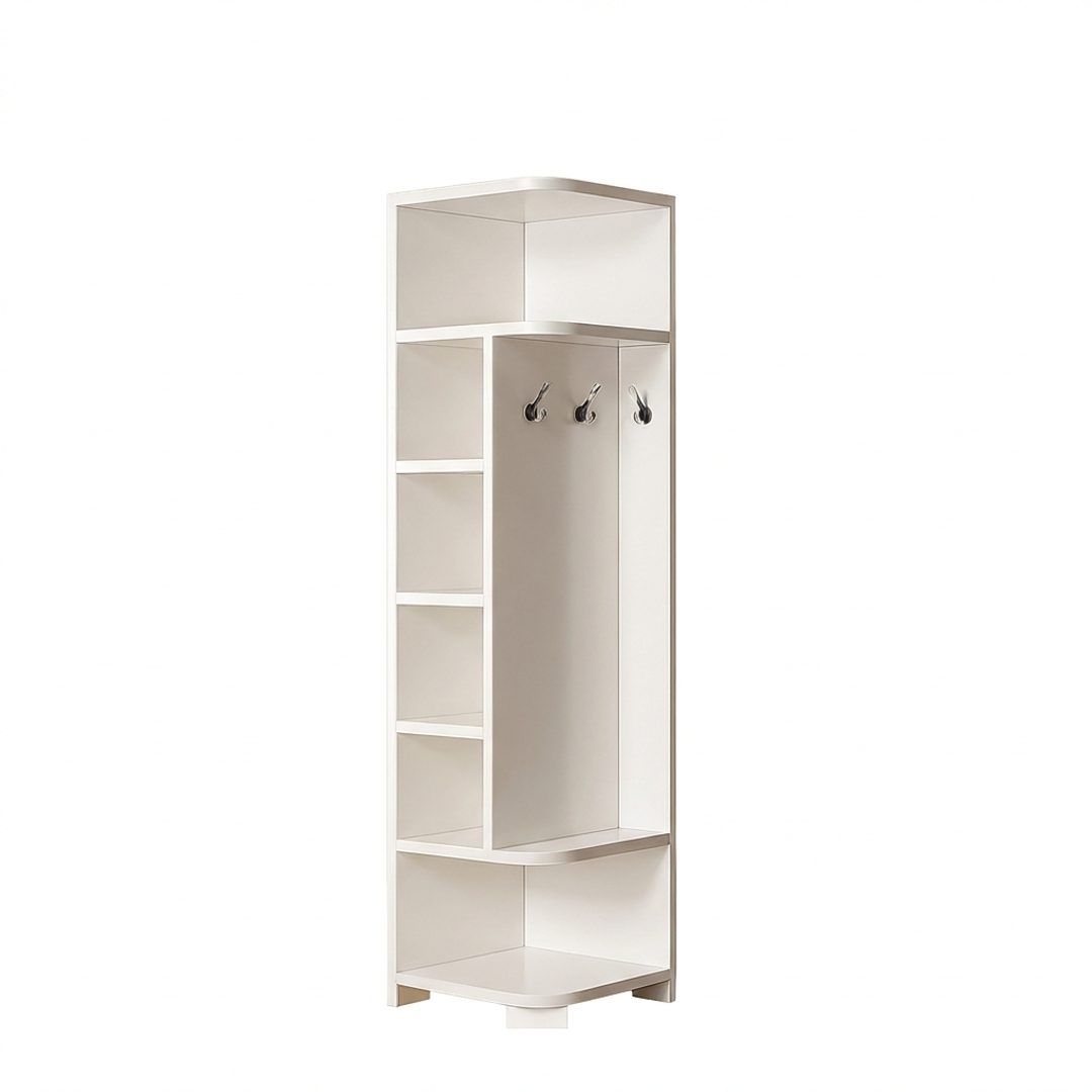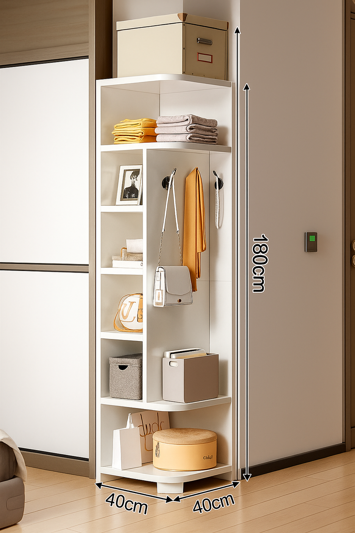 Izrađena od visokokvalitetnog materijala, Lume ugaona polica nudi više polica različitih veličina, omogućavajući vam da odložite knjige, dekorativne predmete, torbe, kutije za pohranu i druge potrepštine. Osim toga, bočni paneli s kukama pružaju dodatni prostor za kačenje odjeće, torbi ili modnih dodataka.