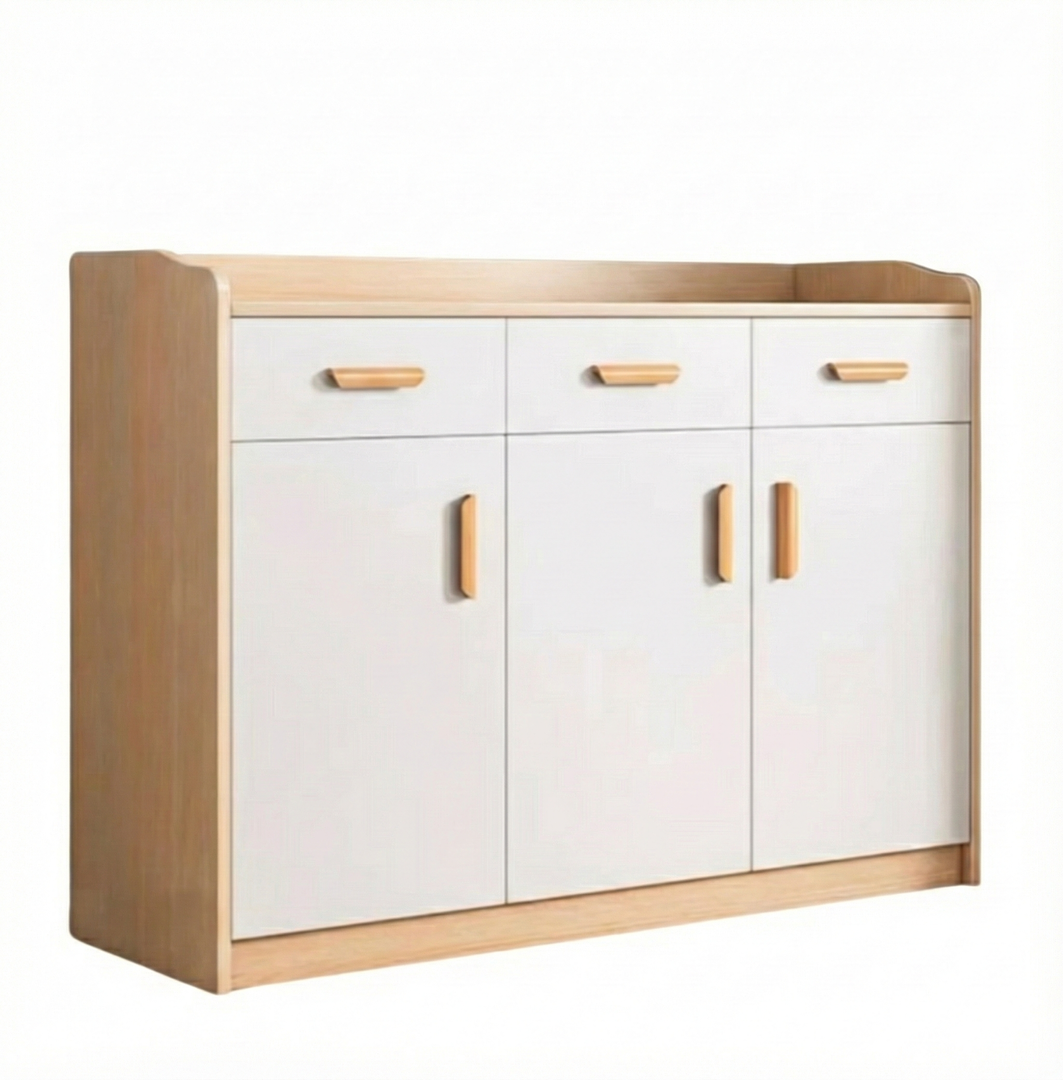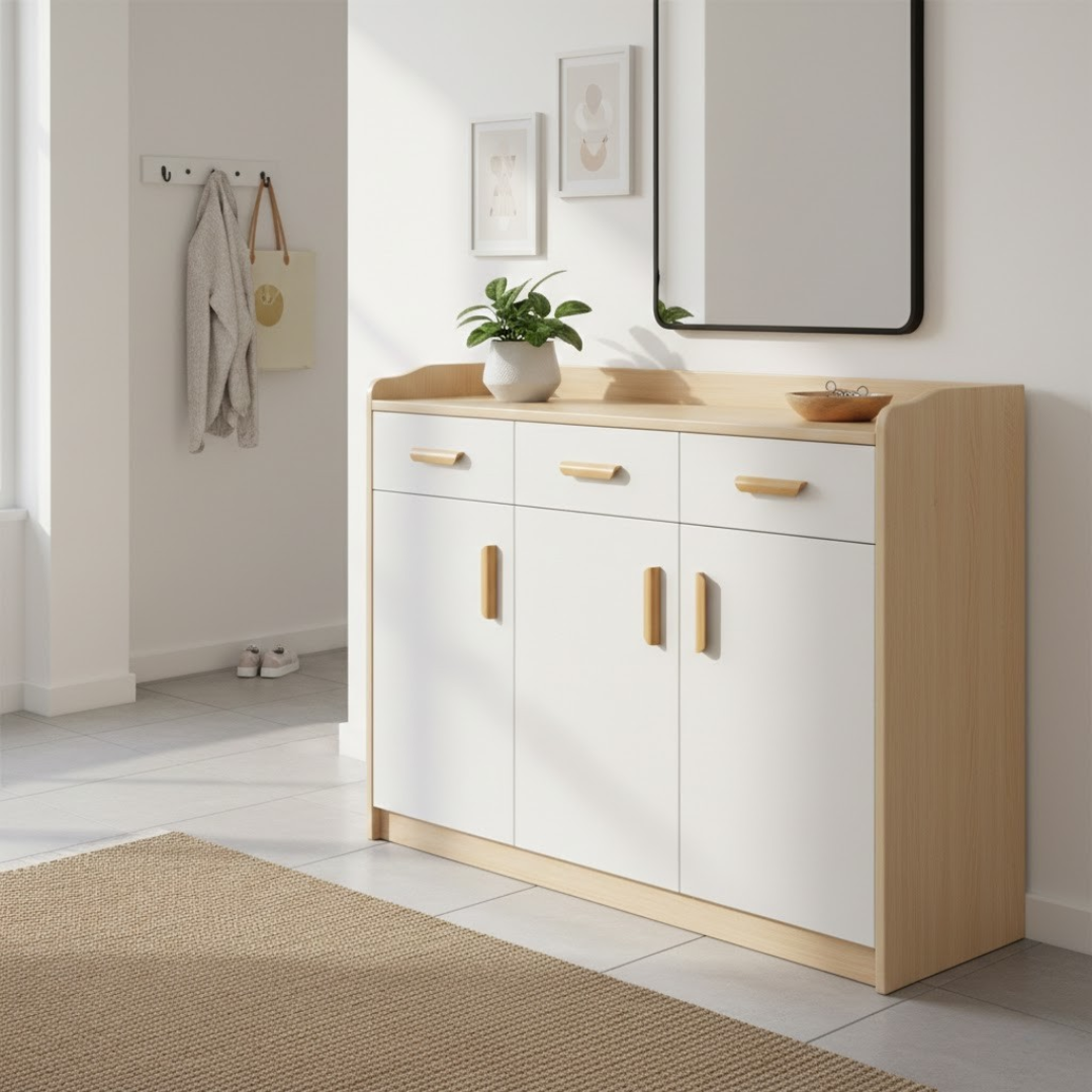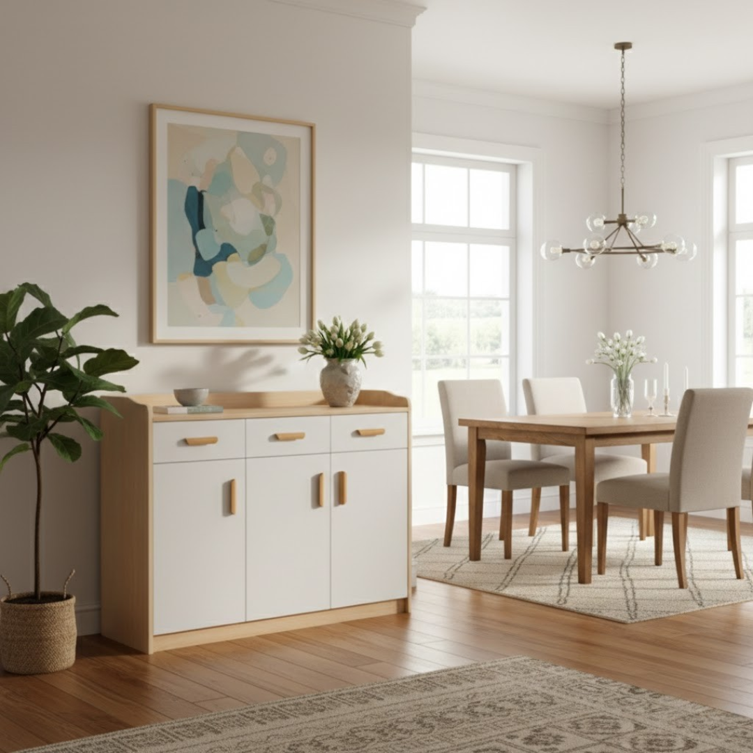 Forra komoda je savršen spoj funkcionalnosti i savremenog dizajna. Sa čistim linijama i kombinacijom svijetlog drveta i bijelih frontova, lako se uklapa u svaki enterijer – bilo da je riječ o kuhinji, trpezariji, dnevnom boravku ili hodniku. Ova komoda nudi obilje prostora za odlaganje, čineći vaš dom organizovanijim i urednijim.