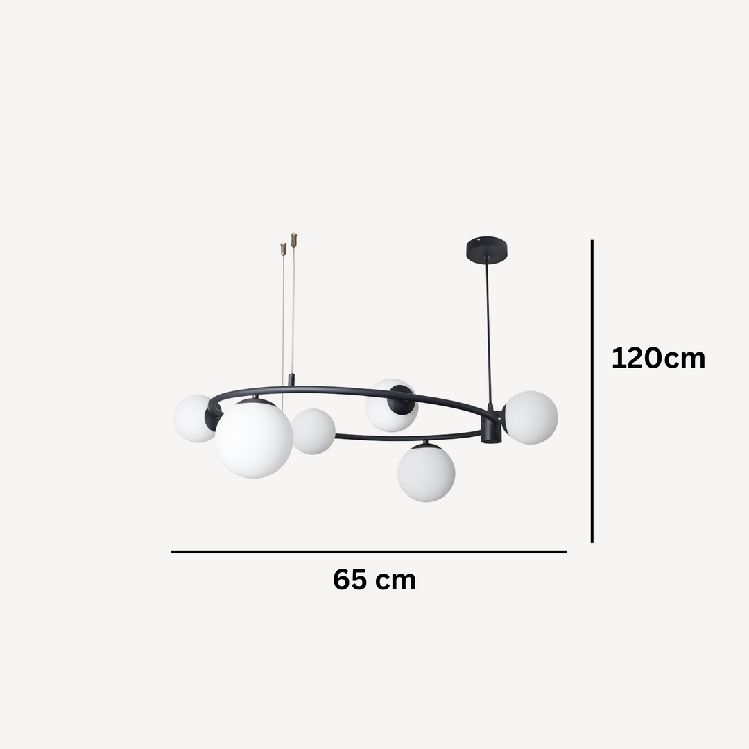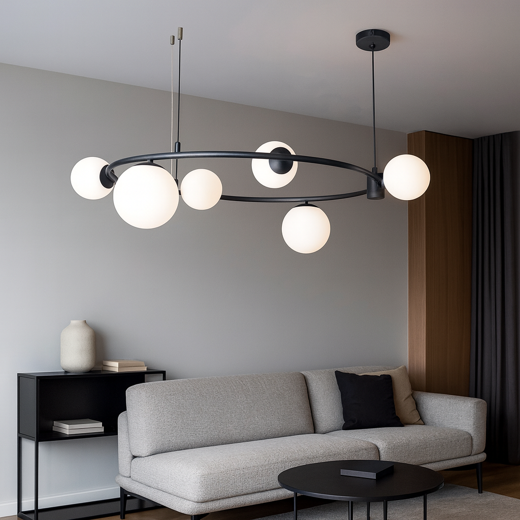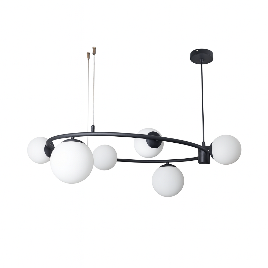 Izrađen od visokokvalitetnih materijala, D8216-6 luster karakteriše elegantna crna metalna konstrukcija s ravnomjerno raspoređenim šest sferičnih stakala koja pružaju meko i prijatno osvjetljenje. Minimalistički dizajn s modernim detaljima savršeno se uklapa u različite stilove enterijera – od industrijskog do skandinavskog.