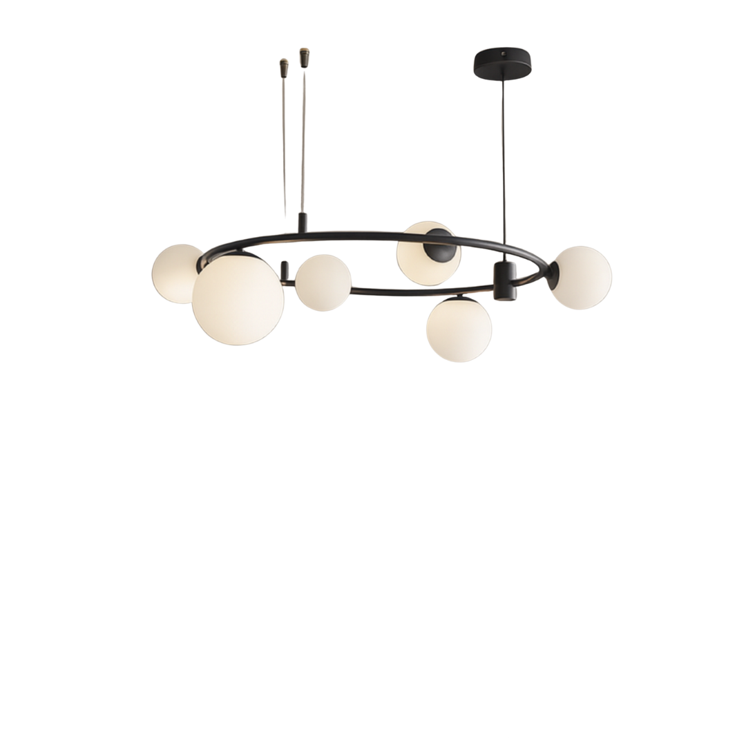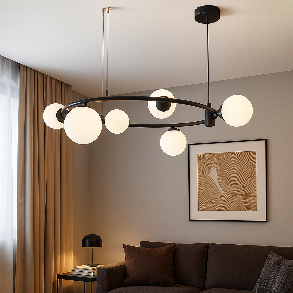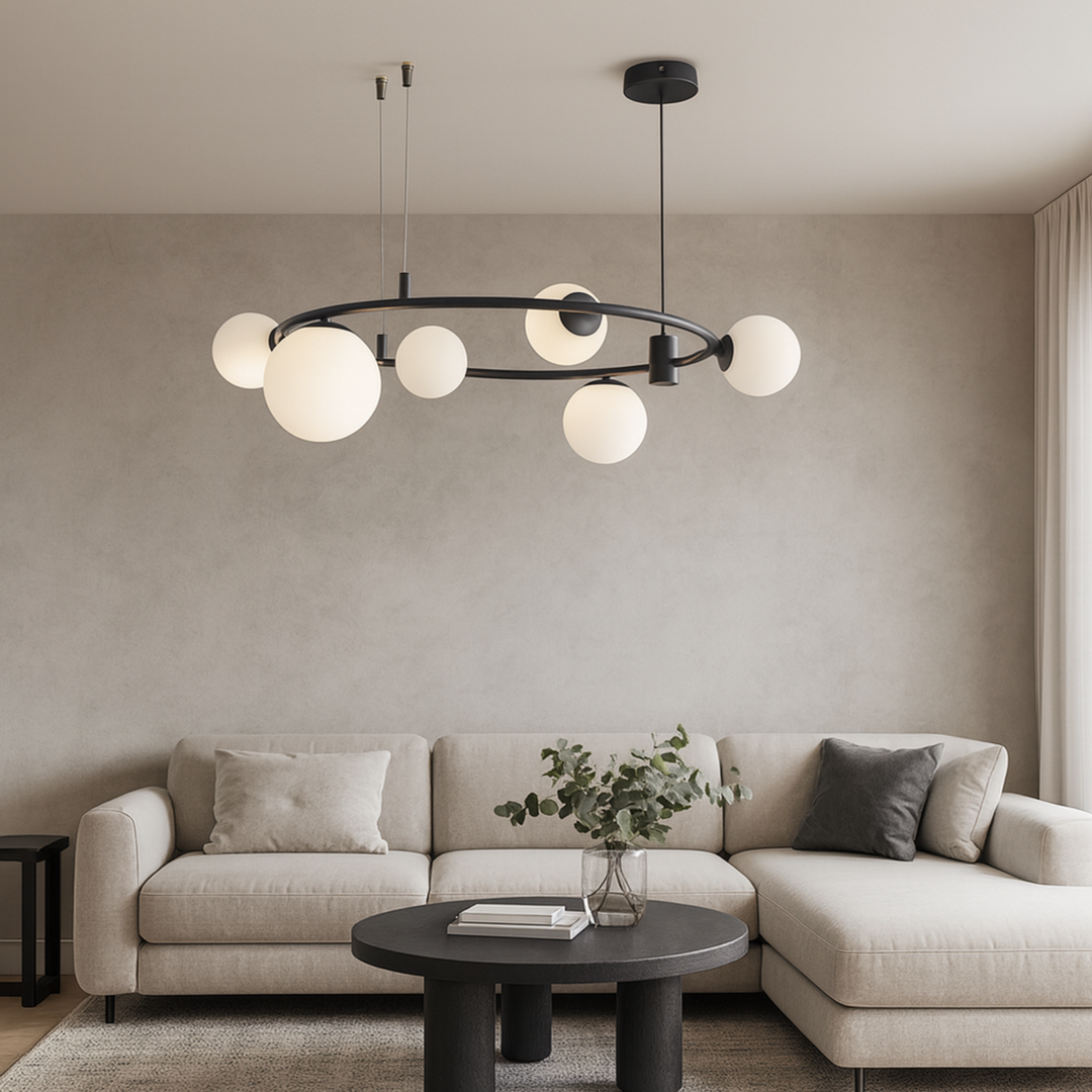 Izrađen od visokokvalitetnih materijala, D8216-6 luster karakteriše elegantna crna metalna konstrukcija s ravnomjerno raspoređenim šest sferičnih stakala koja pružaju meko i prijatno osvjetljenje. Minimalistički dizajn s modernim detaljima savršeno se uklapa u različite stilove enterijera – od industrijskog do skandinavskog.