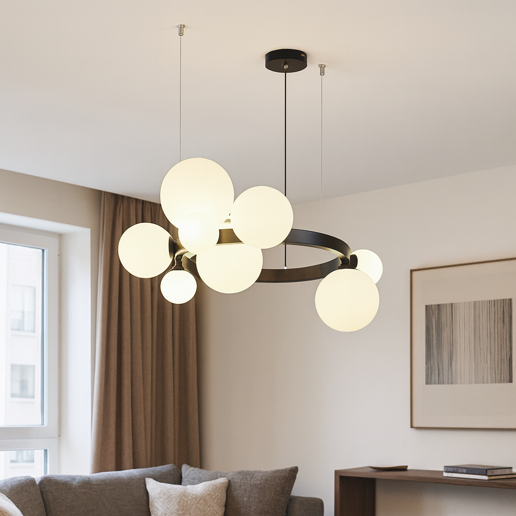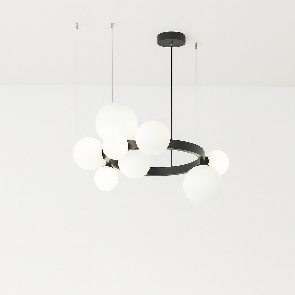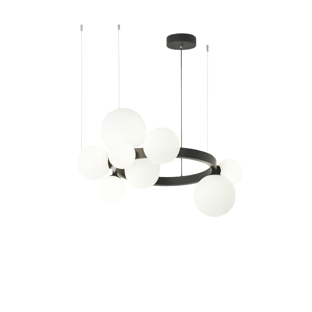 Učinite svoj prostor toplijim i elegantnijim uz viseći luster PENDANT LIGHT D8216-9. Sa savremenim dizajnom u kombinaciji crnog metala i mliječno bijelog stakla, ovaj luster donosi savršen balans između estetike i funkcionalnosti.