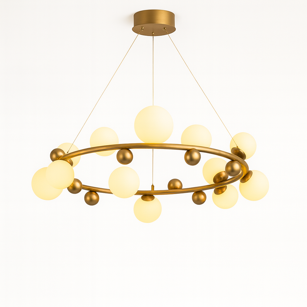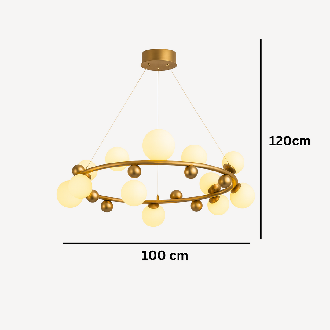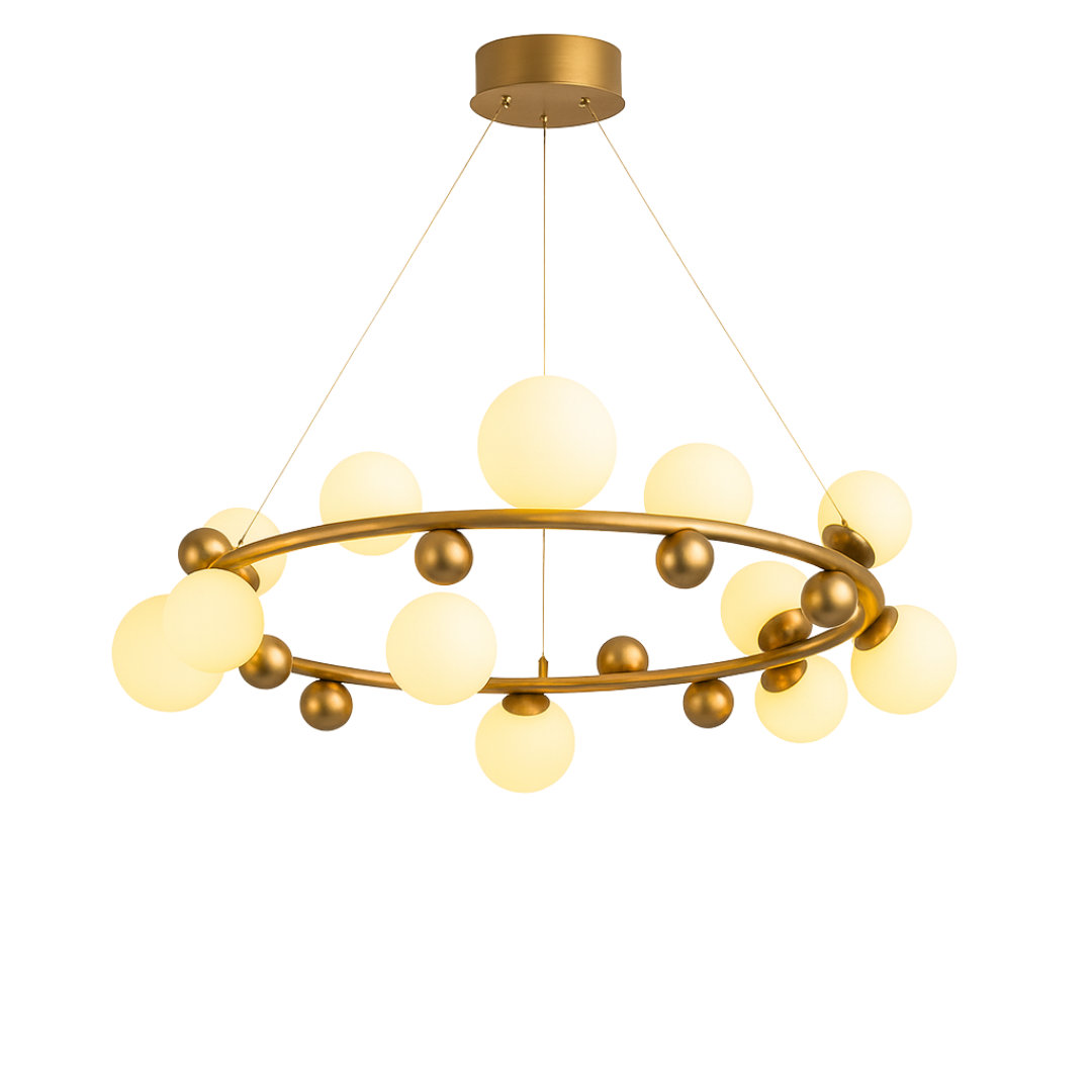 Izrađen od kvalitetnog metala u zlatnoj završnici i ukrašen sa 12 staklenih kugli u bijelom tonu, luster D8213-12 pruža toplo i ravnomjerno svjetlo, stvarajući ugodnu atmosferu i sofisticiran izgled. Njegova geometrijska konstrukcija i viseći dizajn čine ga pravim fokusnim elementom svakog enterijera.