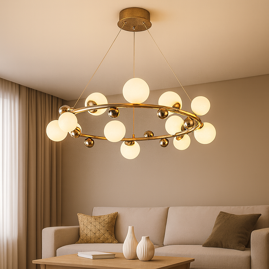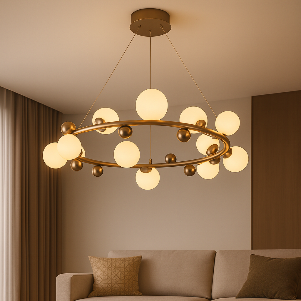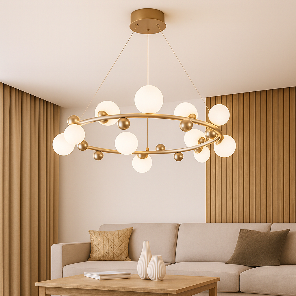 Izrađen od kvalitetnog metala u zlatnoj završnici i ukrašen sa 12 staklenih kugli u bijelom tonu, luster D8213-12 pruža toplo i ravnomjerno svjetlo, stvarajući ugodnu atmosferu i sofisticiran izgled. Njegova geometrijska konstrukcija i viseći dizajn čine ga pravim fokusnim elementom svakog enterijera.