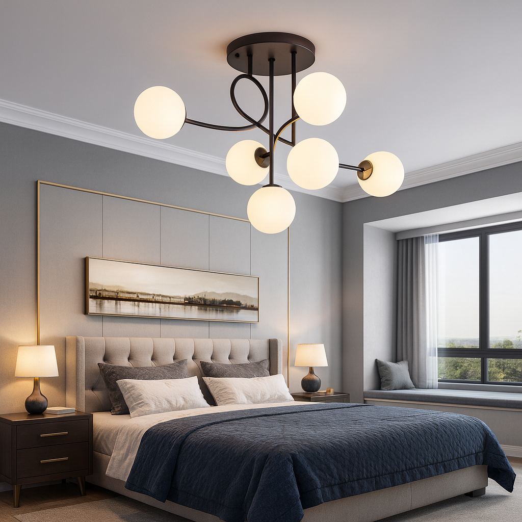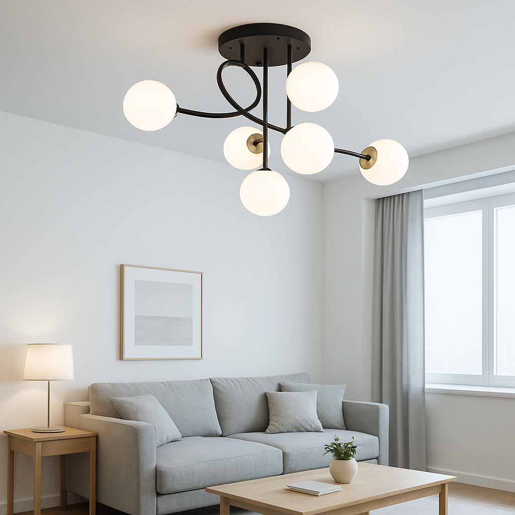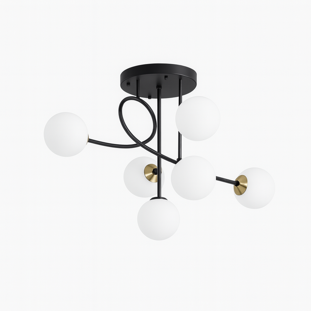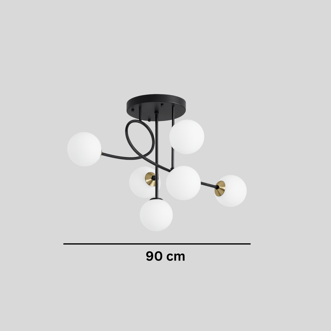 Opremljen sa šest matiranih staklenih kugli, koje su raspoređene na elegantnim crnim metalnim granama sa zlatnim detaljima, D8164-6 savršeno balansira između minimalizma i luksuza. Njegova geometrijska forma unosi moderan karakter i postaje centralna tačka svake prostorije.