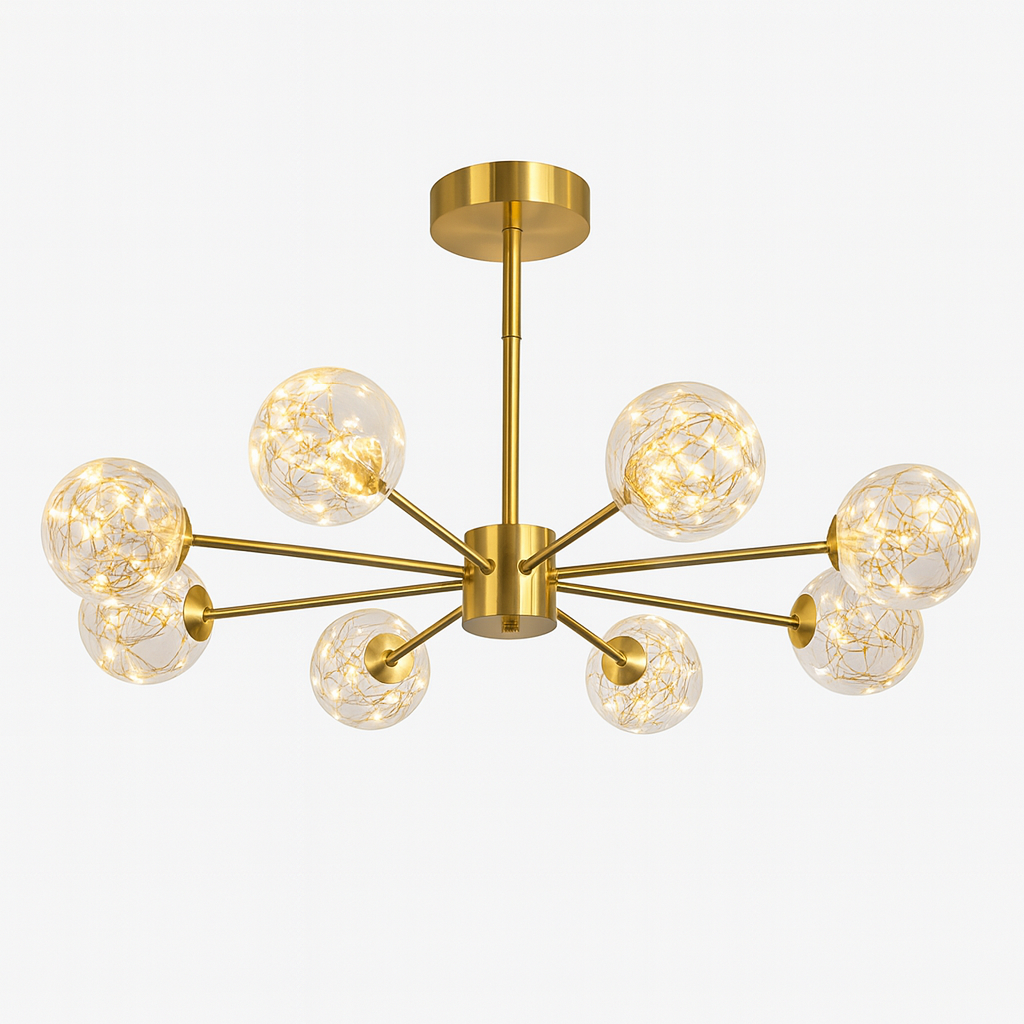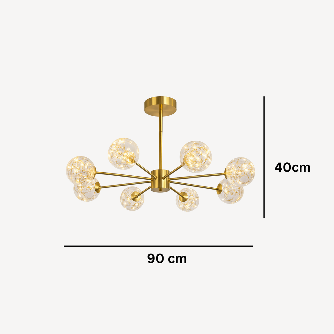 Unesite dozu luksuza i savremenog dizajna u svoj prostor sa lusterom D8210-8, idealnim izborom za moderne dnevne sobe, trpezarije ili kancelarije. Sa dimenzijama 90 cm širine i 40 cm visine, ovaj prepoznatljivi luster sa 8 staklenih kugli u zlatnoj završnoj obradi postaje centralna tačka svakog enterijera.