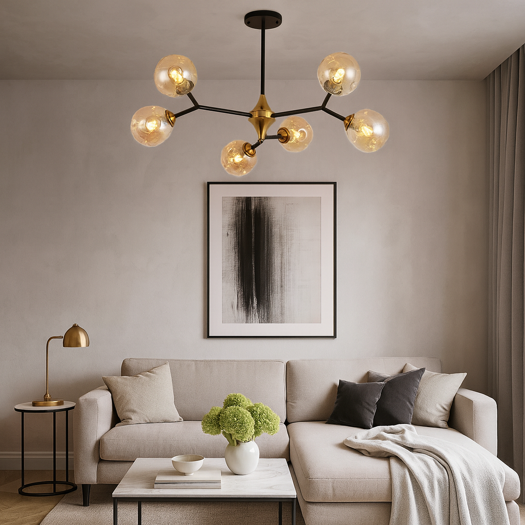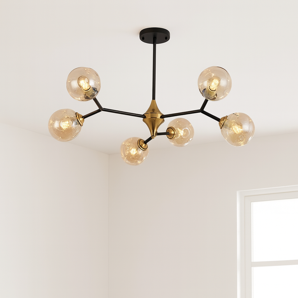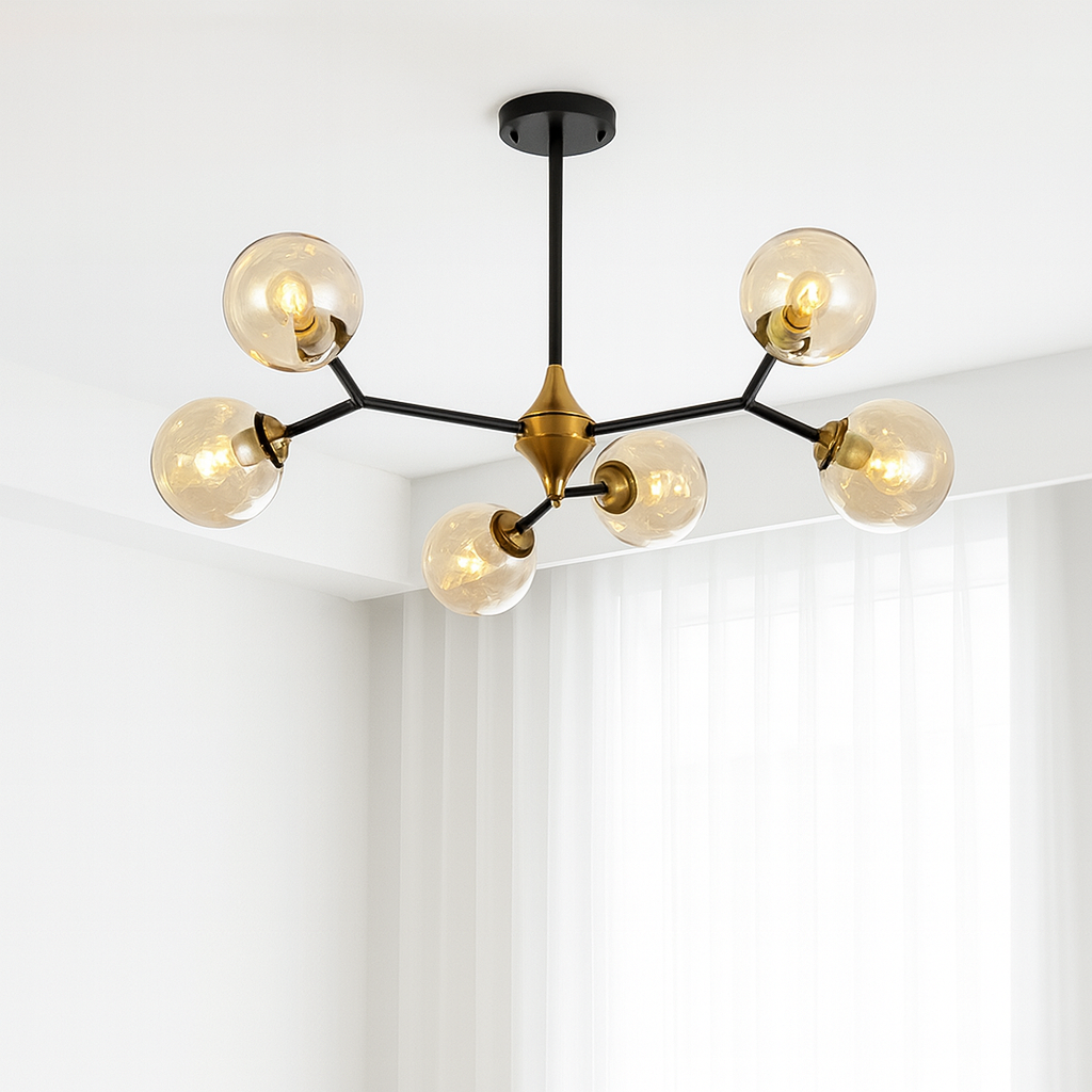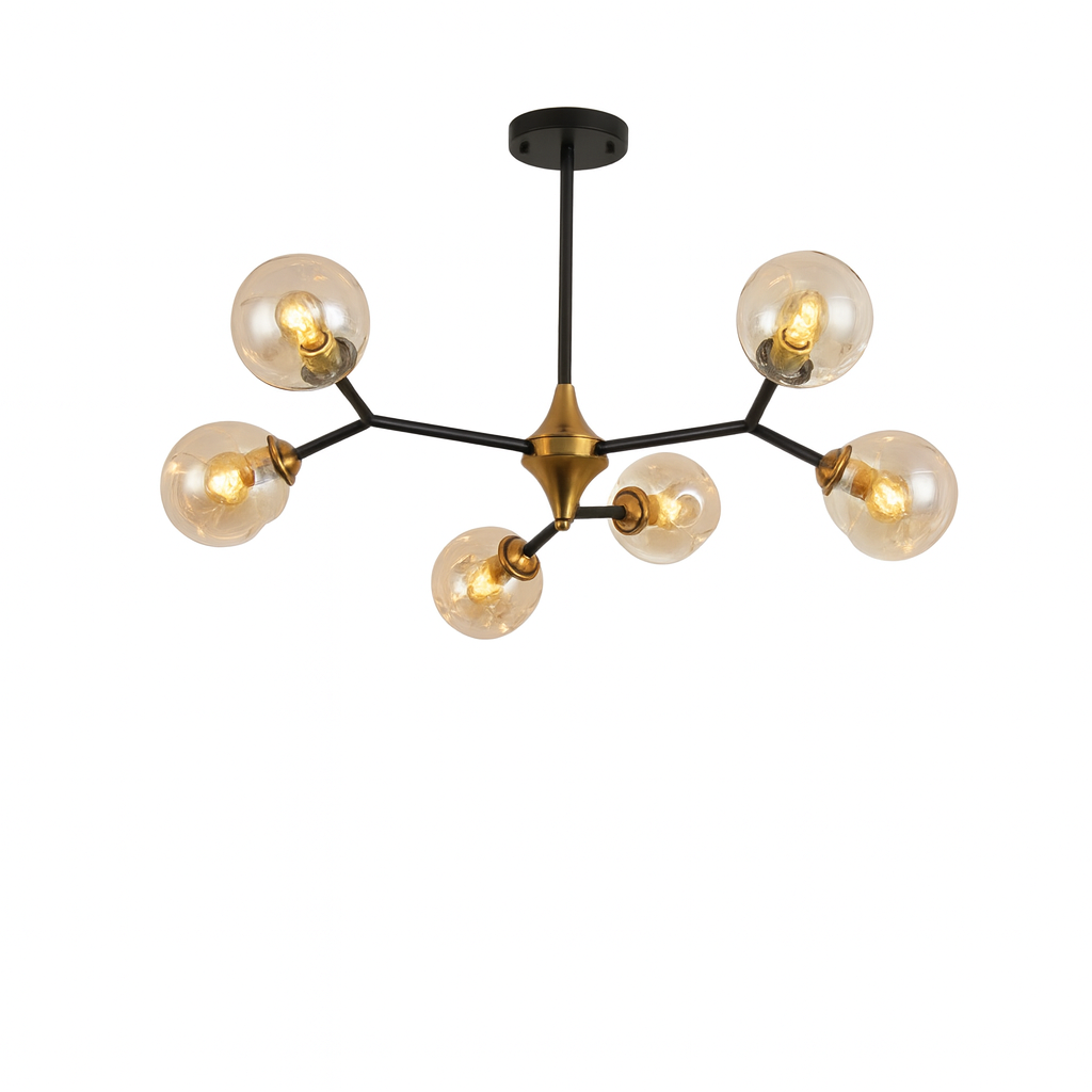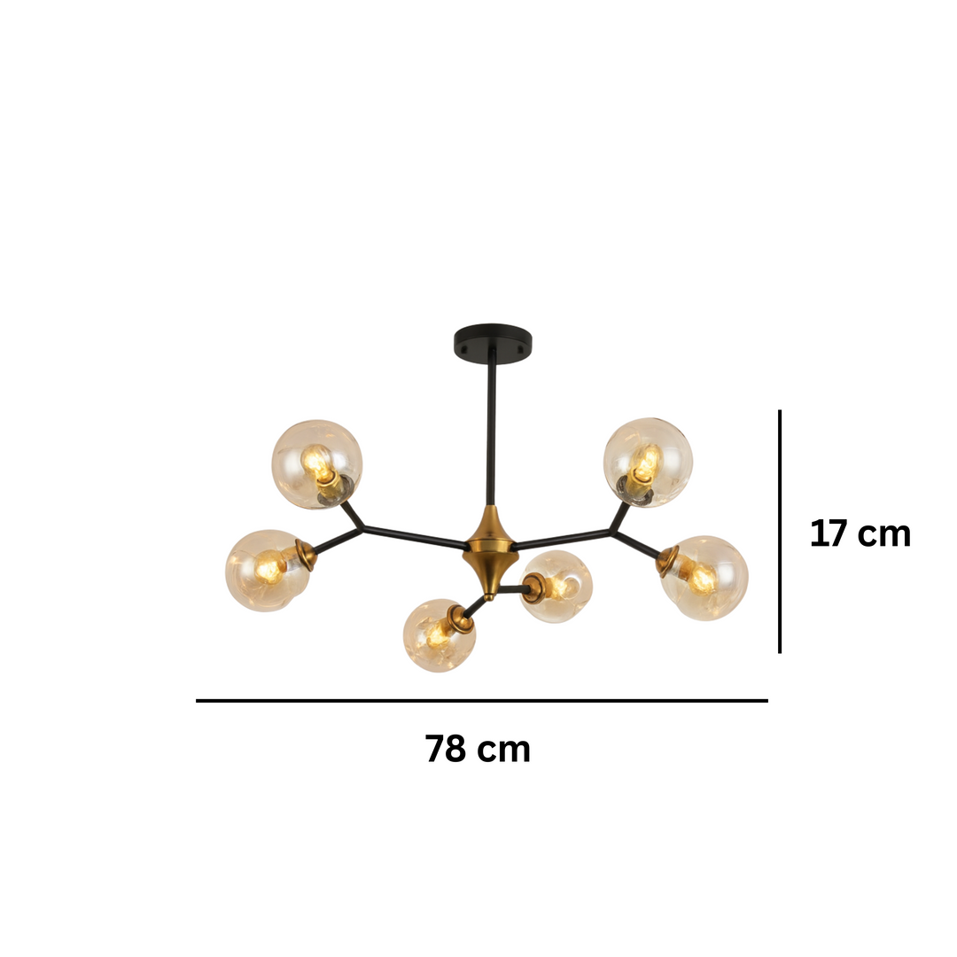 Izrađen od kvalitetnih materijala, sa metalnim crnim tijelom i zlatnim akcentima, te šest staklenih kugli sa LED sijalicama, ovaj model idealan je za dnevne sobe, trpezarije, moderne kuhinje ili poslovne prostore.