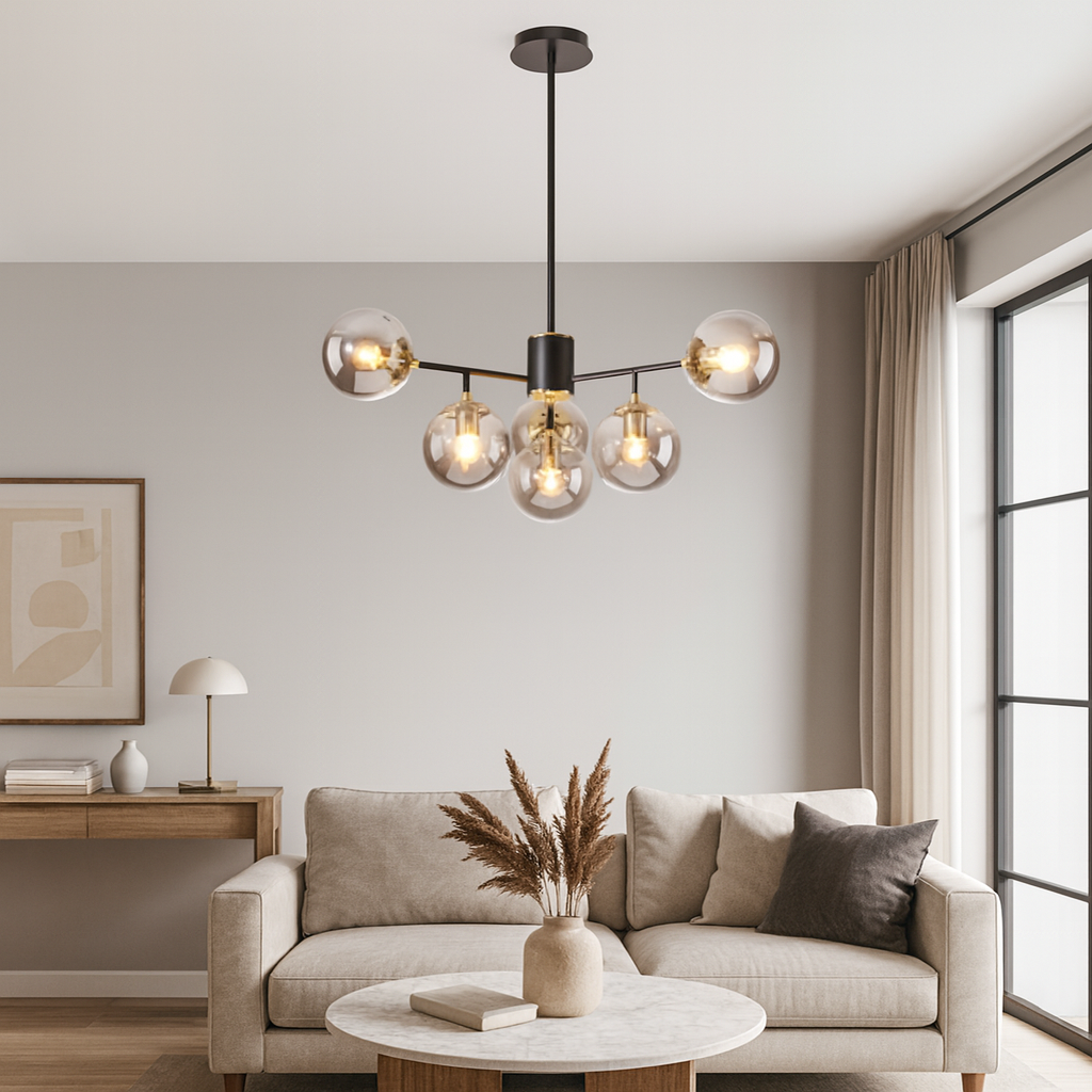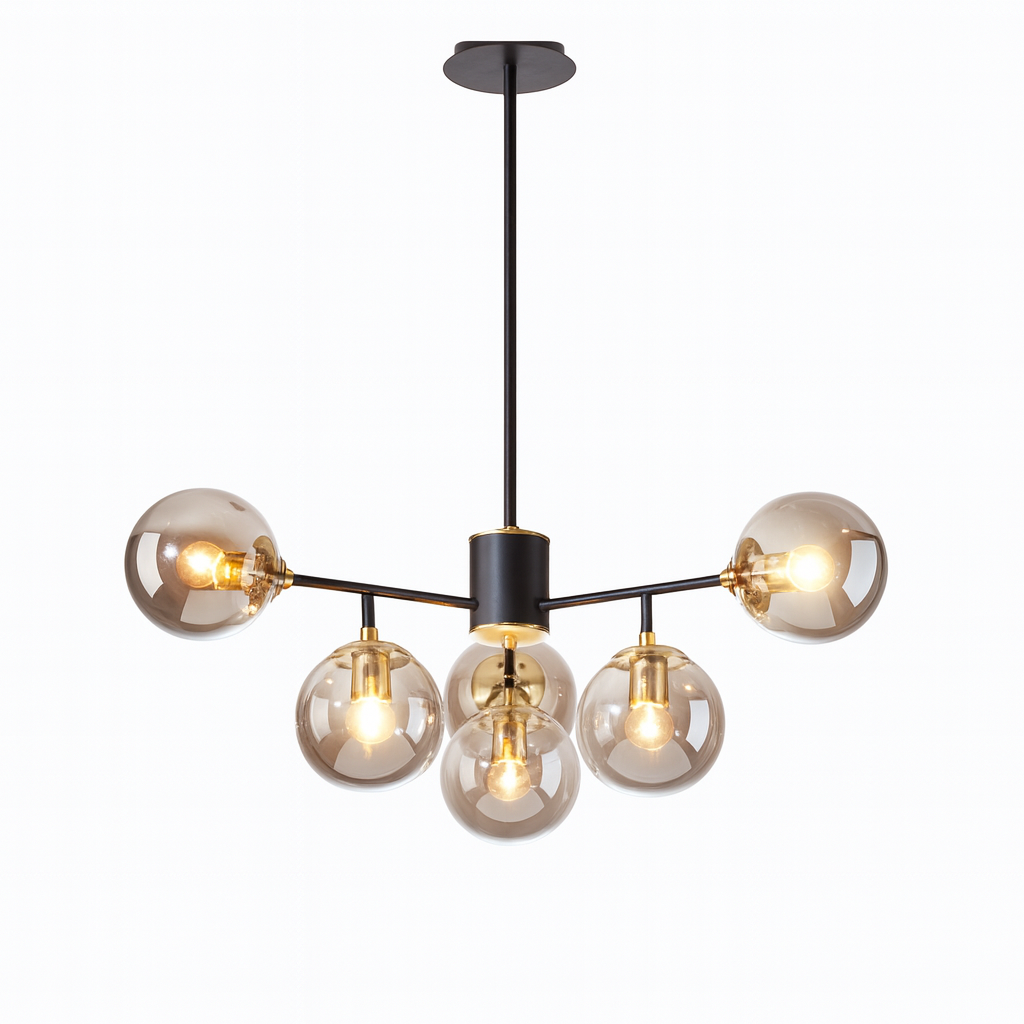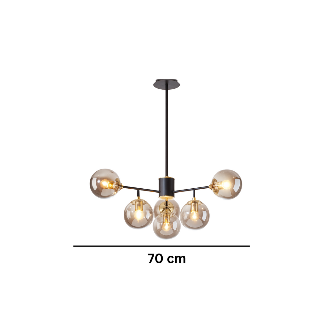 Unesite sofisticiranost i moderan dizajn u svoj prostor s elegantnim lusterom D8263-6, prečnika 70 cm. Ovaj luksuzni luster sa šest staklenih kugli u kombinaciji crne i dimičasto sive boje idealan je izbor za dnevne sobe, trpezarije, hodnike ili kancelarije koje zahtijevaju savremeni ambijent.