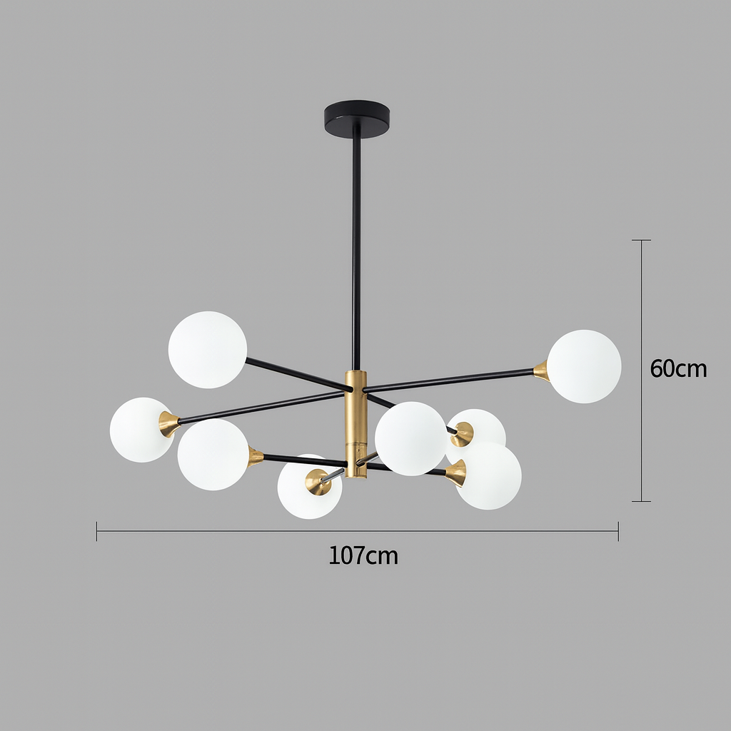 Unesite sofisticiranost i moderni dizajn u svoj dom sa pendant lusterom D8072-8, izrađenim od visokokvalitetnih materijala: metal, aluminij i staklo. Ovaj prefinjeni luster kombinuje crnu i mliječno bijelu boju, stvarajući savršen balans između minimalističkog stila i luksuznog izgleda.