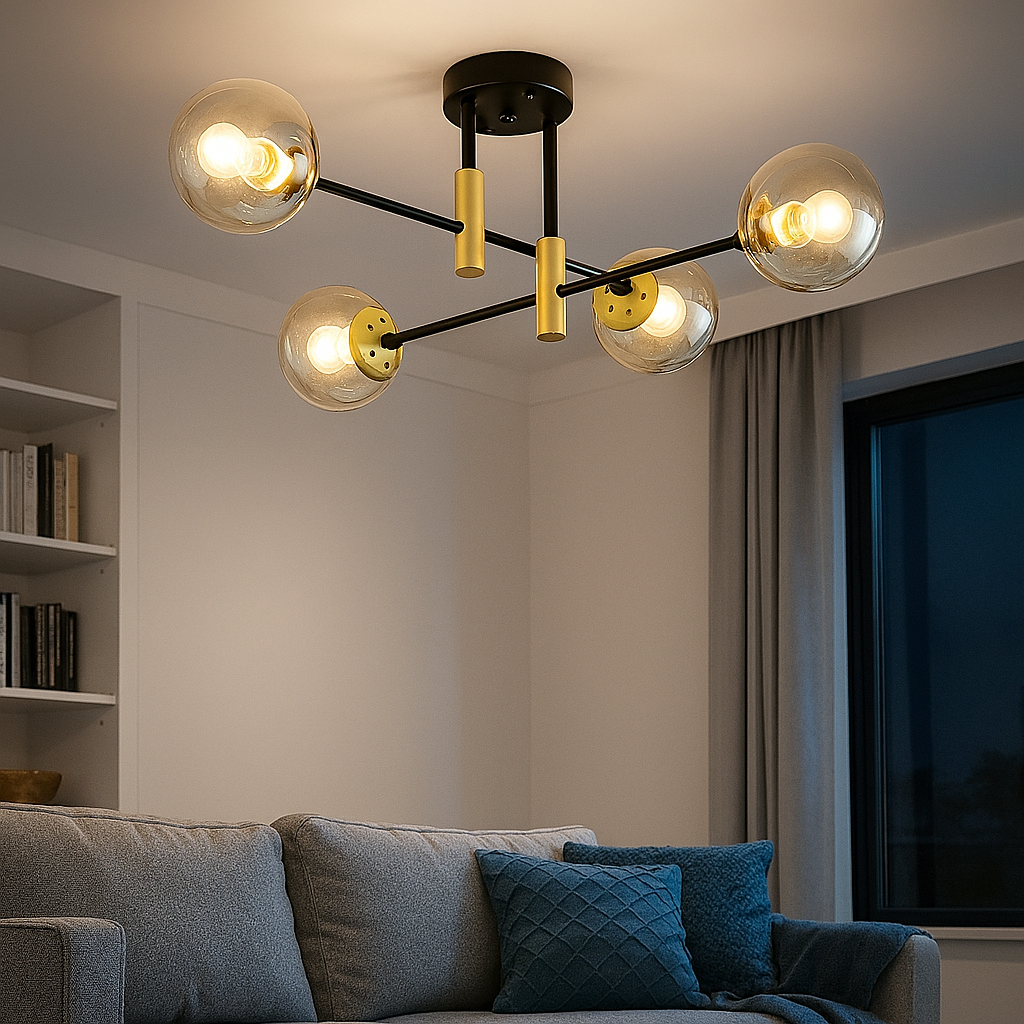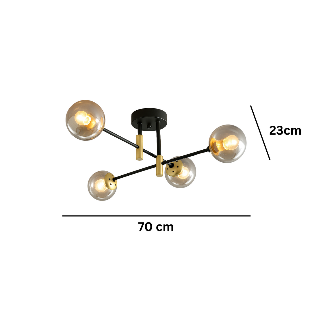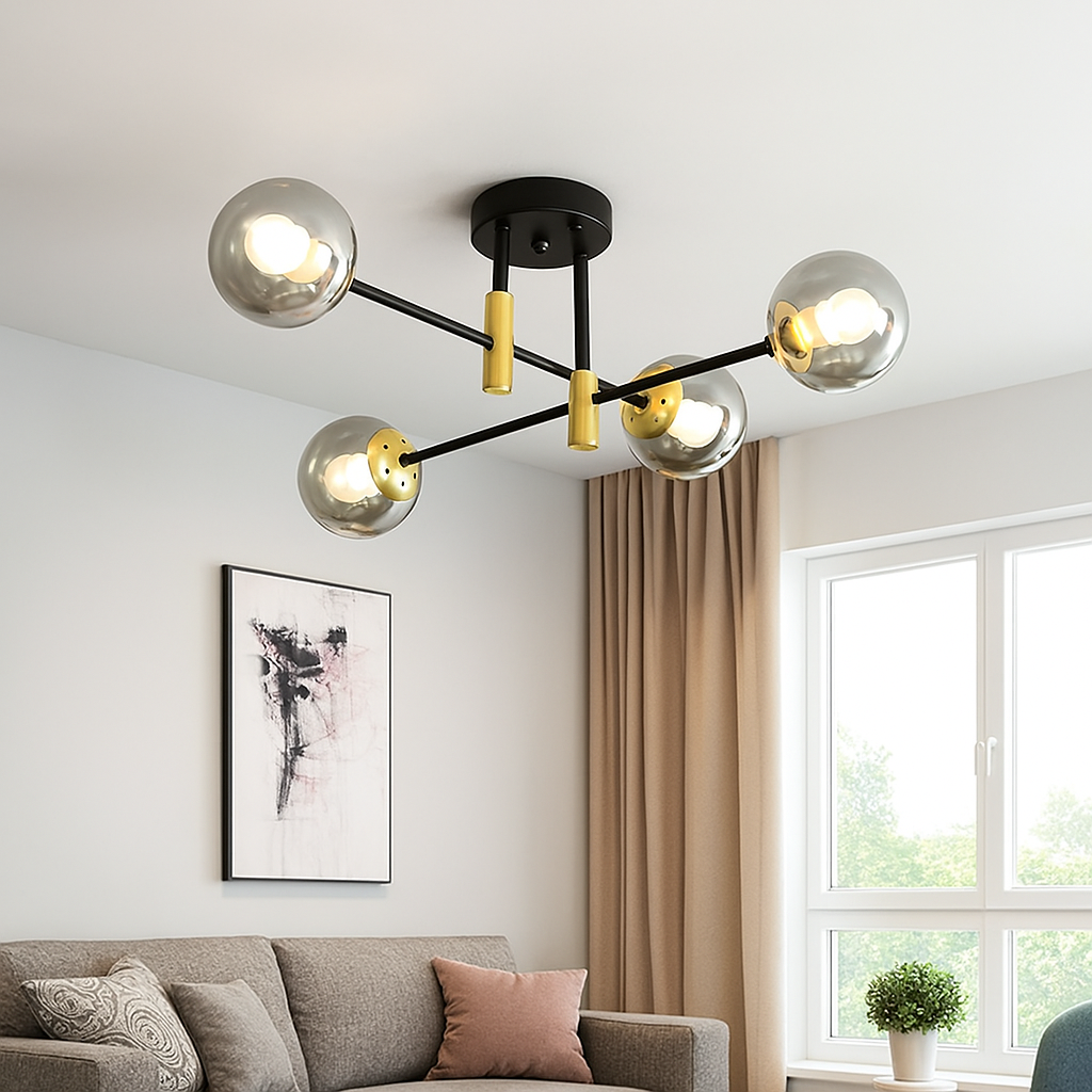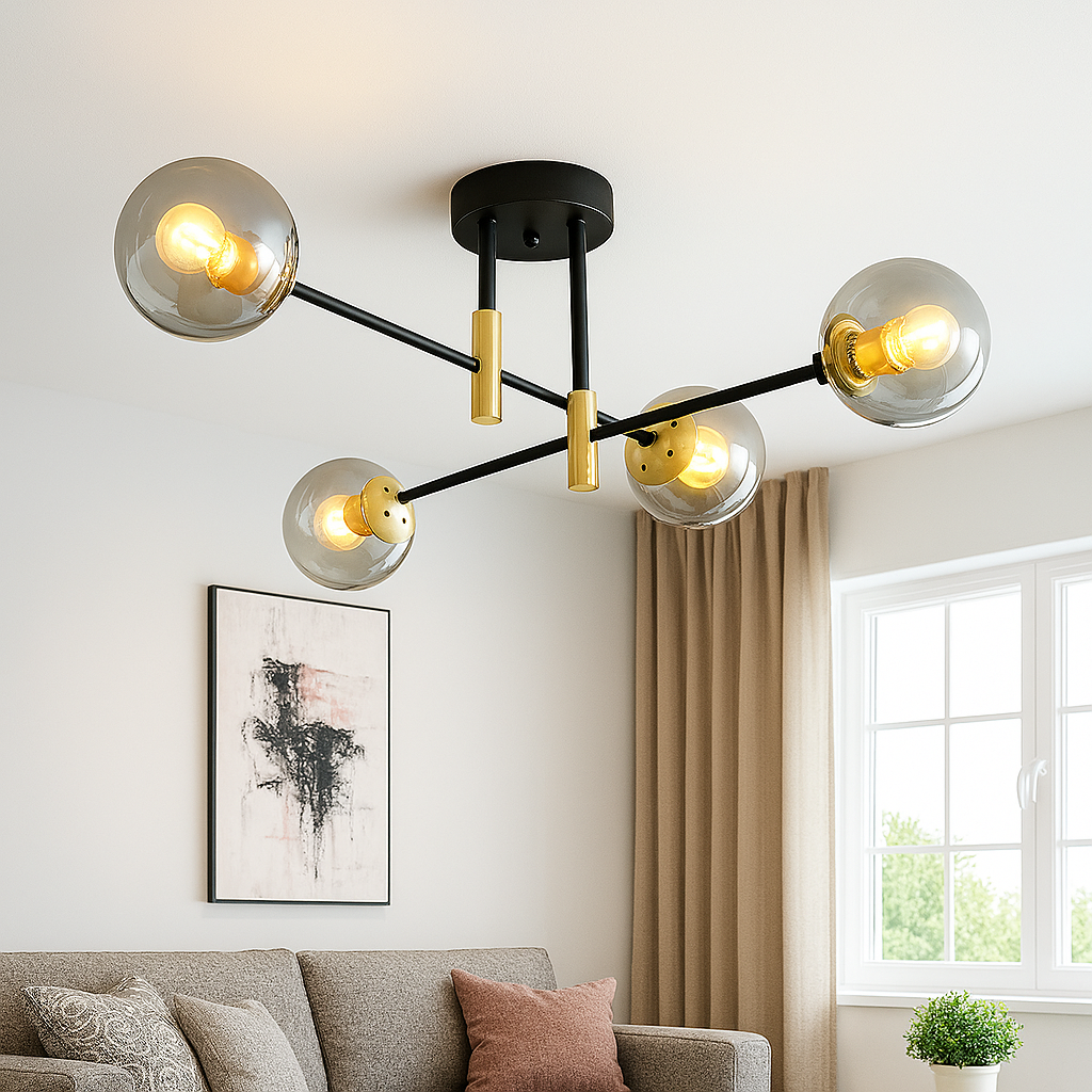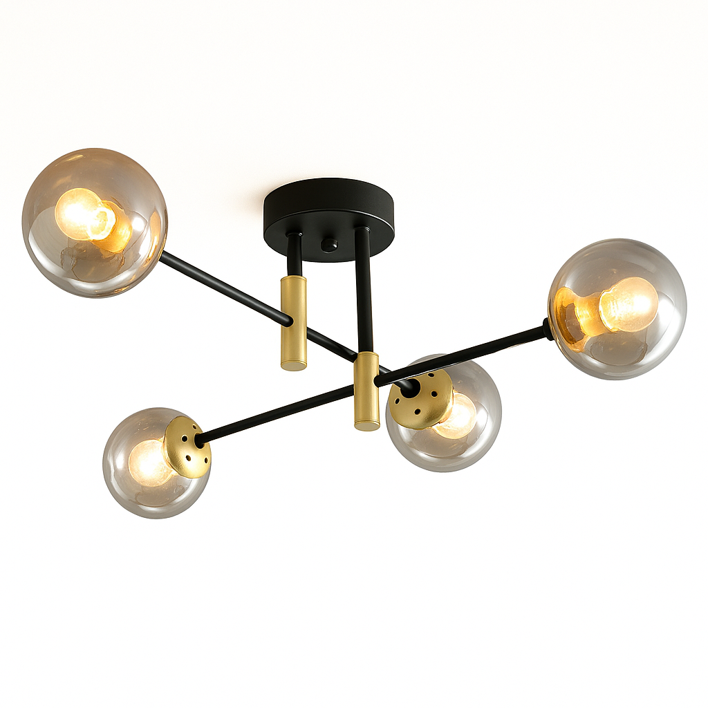 Izrađen s pažnjom na detalje, luster D8060-4A kombinuje metalnu konstrukciju u crnoj i zlatnoj boji sa četiri staklene kugle koje ravnomjerno raspršuju svjetlost. Njegov minimalistički, ali efektan dizajn savršen je izbor za ljubitelje modernog enterijera.