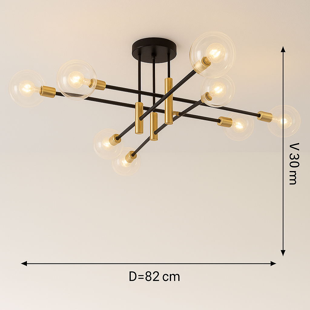 Sa dimenzijama D82*V30CM, lampa je dovoljno velika da pruži snažnu rasvjetu, ali i dovoljno profinjena da se uklopi u različite stilove enterijera. Kombinacija crne i zlatne boje sa prozirnim staklenim kuglama i aluminijskim dekorativnim žicama daje ovoj plafonskoj lampi poseban šarm i modernu notu.