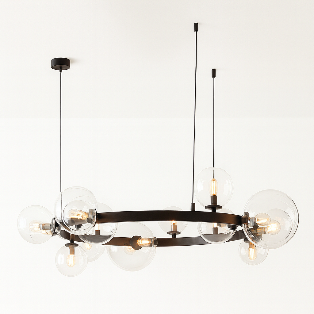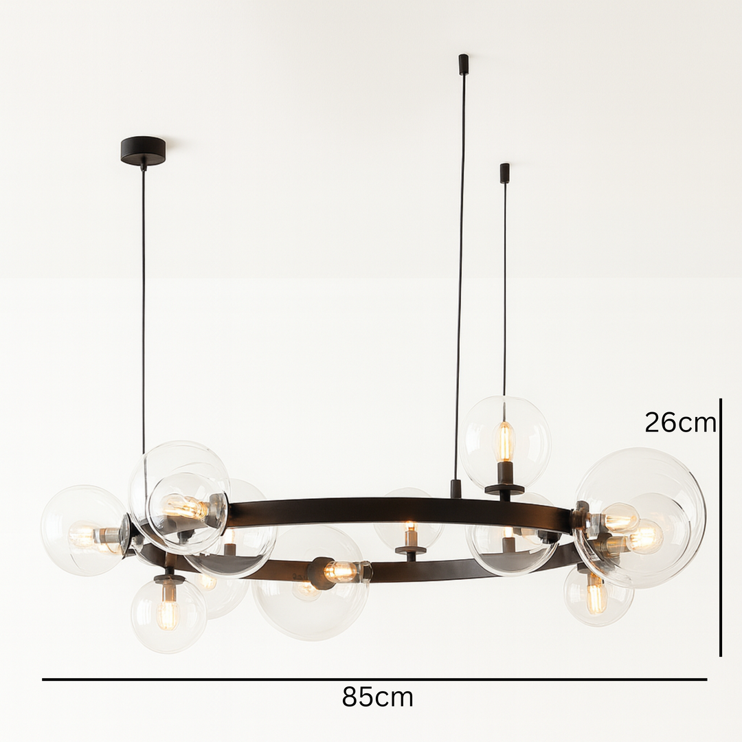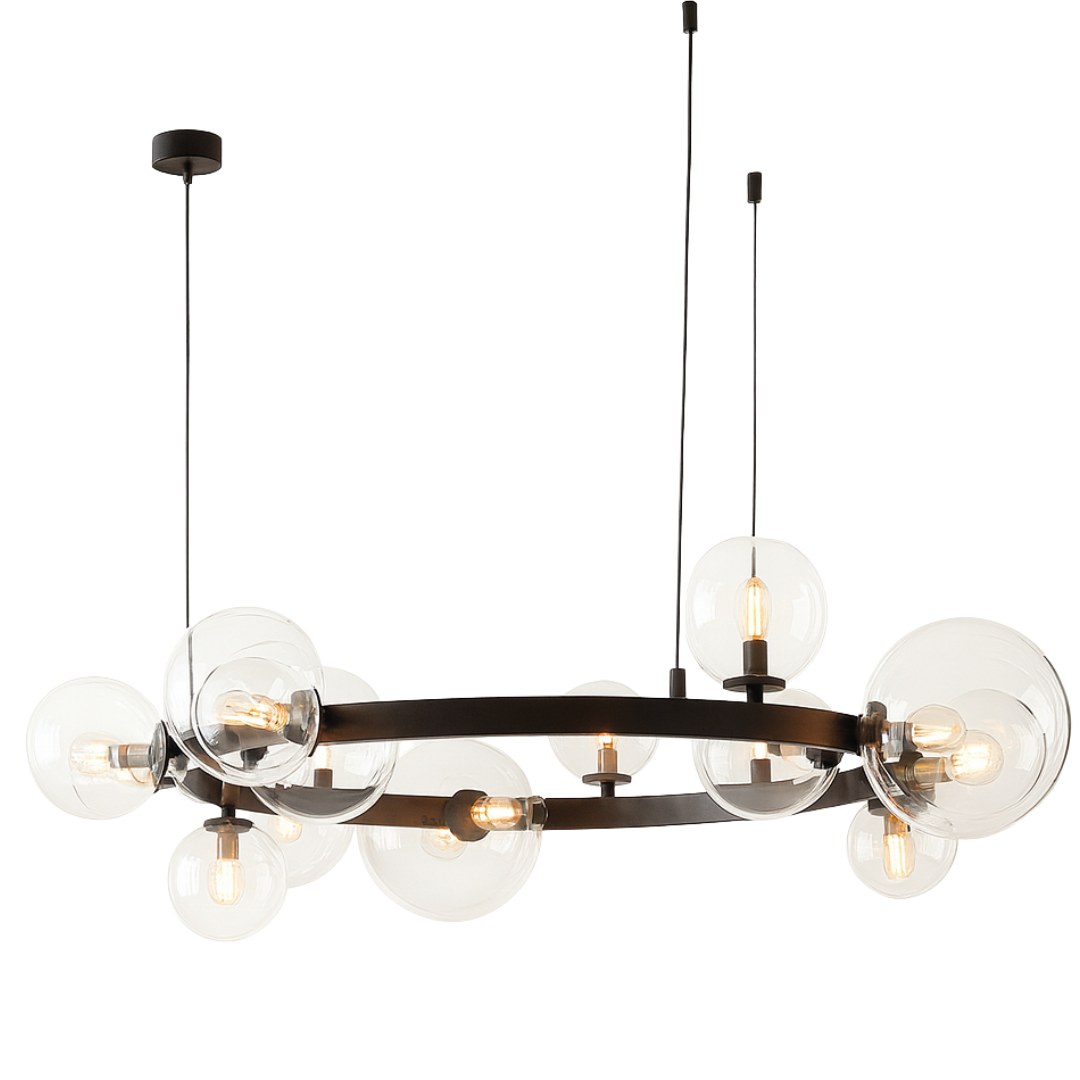 Pendant Light D8031R/15 je luksuzna visilica izrađena od crnog metala i stakla, sa upečatljivim dizajnom kružne forme na kojoj je raspoređeno 15 svjetlosnih kugli (G9 sijalična grla). Ovaj model pruža moćno osvjetljenje i postaje centralni dekorativni element prostora.