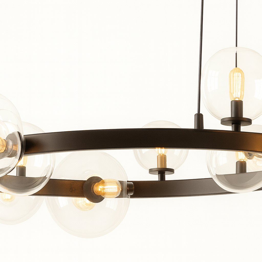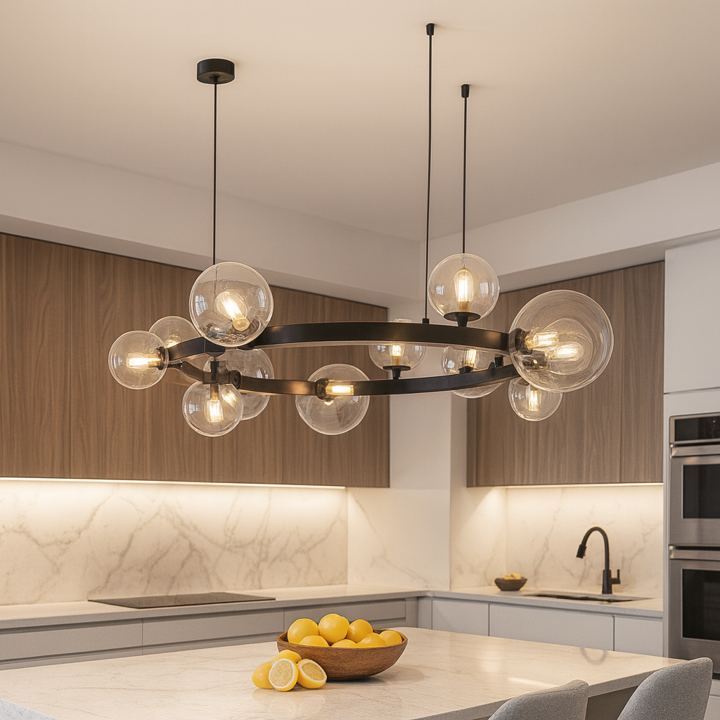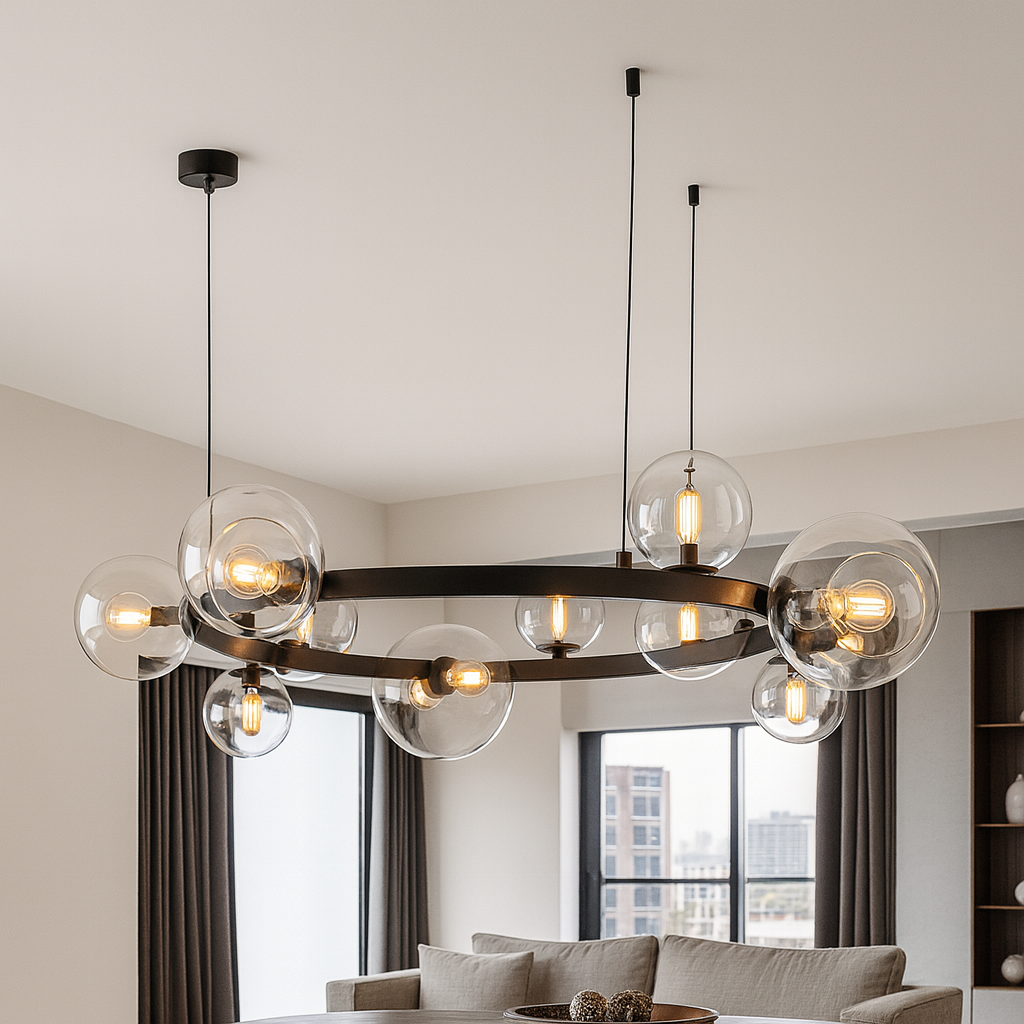 Pendant Light D8031R/15 je luksuzna visilica izrađena od crnog metala i stakla, sa upečatljivim dizajnom kružne forme na kojoj je raspoređeno 15 svjetlosnih kugli (G9 sijalična grla). Ovaj model pruža moćno osvjetljenje i postaje centralni dekorativni element prostora.