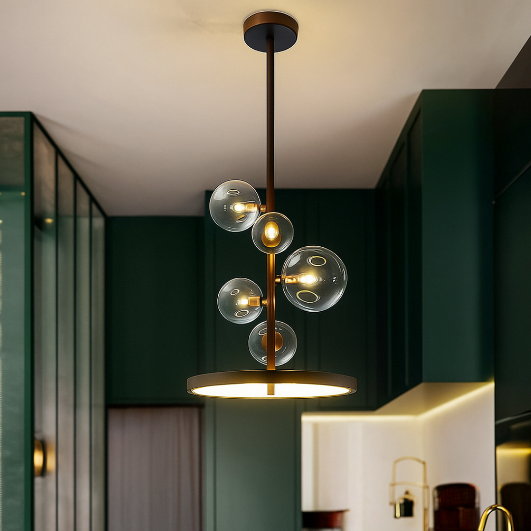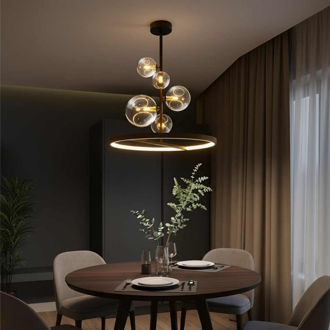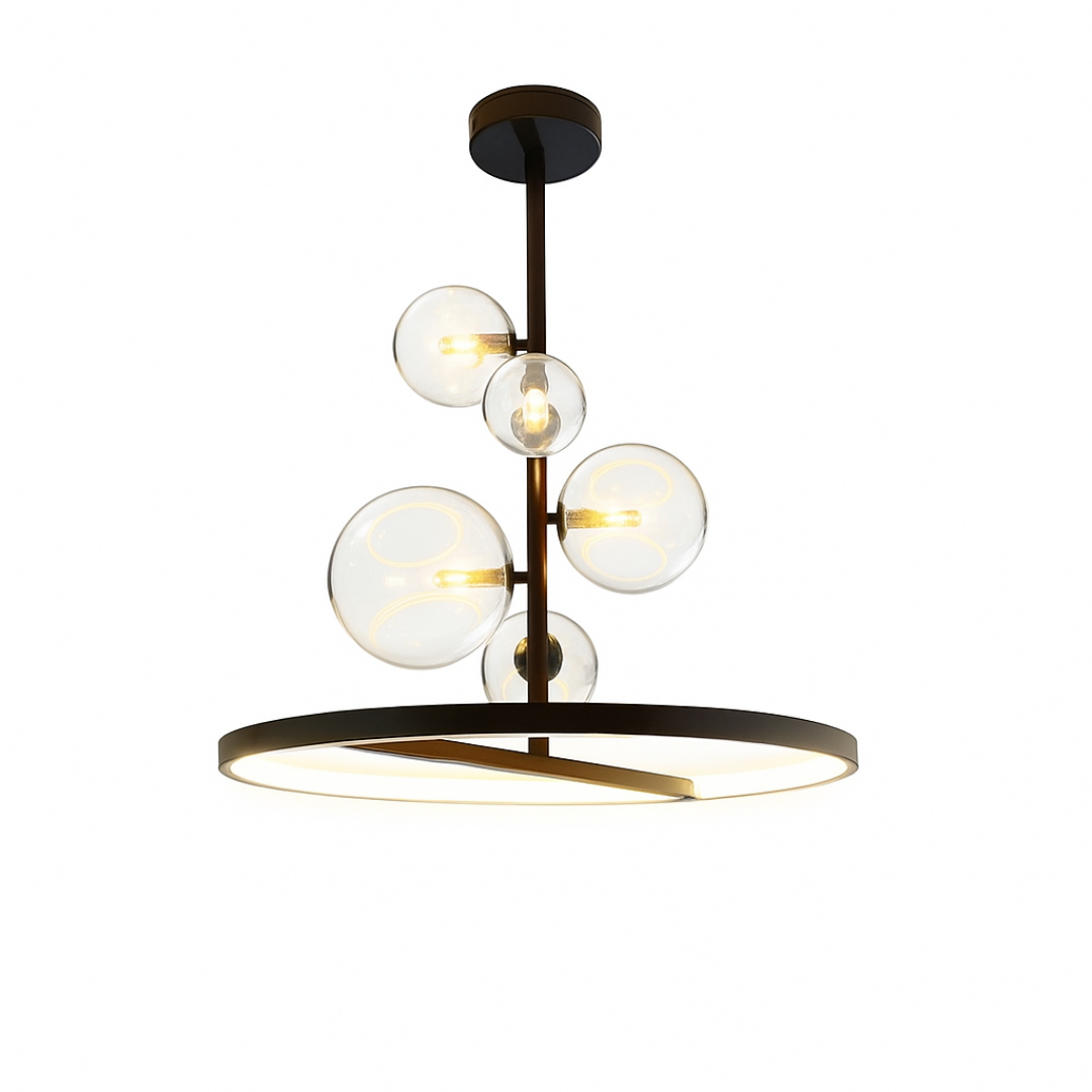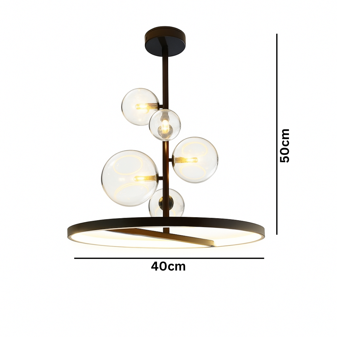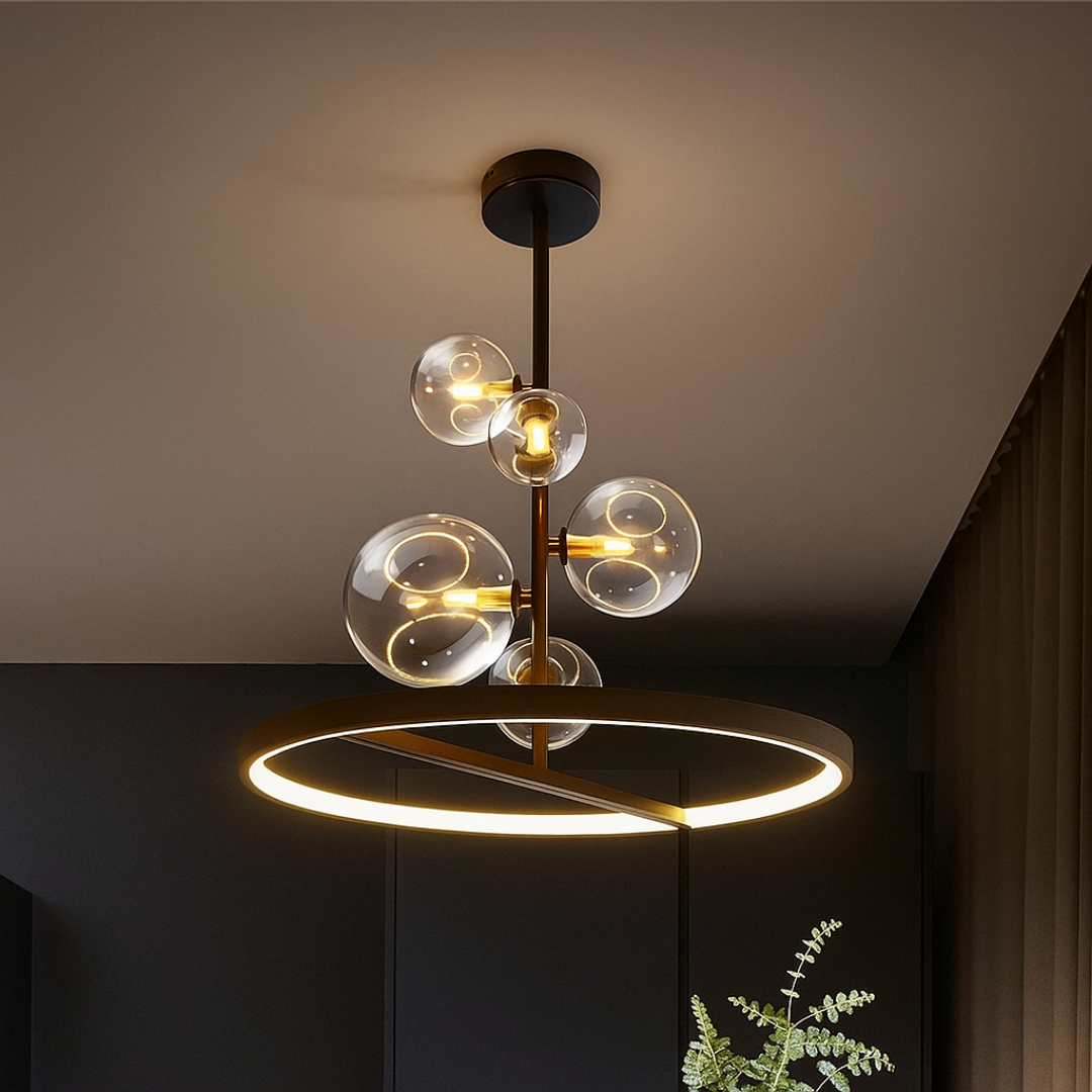 Dvostruko Osvjetljenje: Luster kombinuje svjetlost iz 5 pojedinačnih G9 sijalica u staklenim kuglama i ambijentalno svjetlo iz integrisanog LED prstena na dnu.