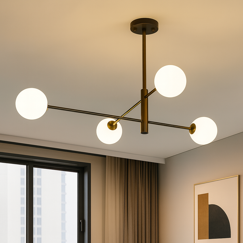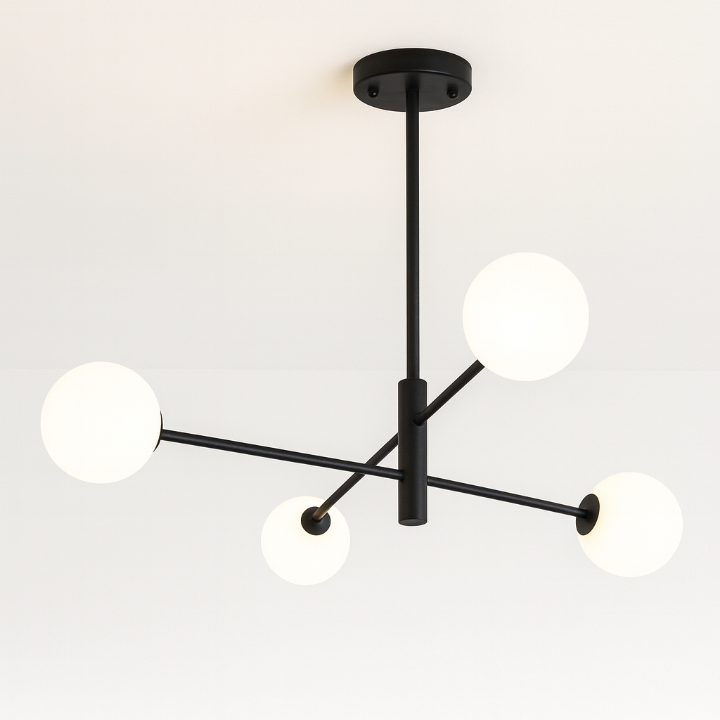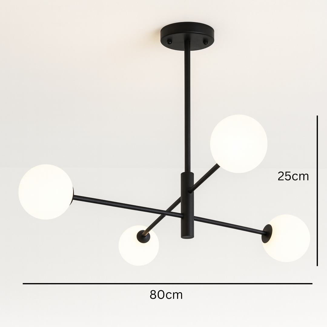 Sa dimenzijama D80×V25 cm i dodatnim štapom 20+30 cm, ovaj model omogućava prilagodljivu visinu, što ga čini pogodnim za različite tipove prostora. Četiri staklene kugle ravnomjerno raspršuju svjetlost i pružaju toplu, ugodnu atmosferu u dnevnim sobama, trpezarijama, restoranima ili poslovnim prostorima.