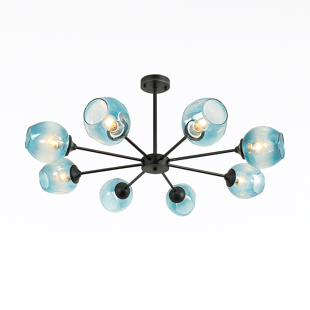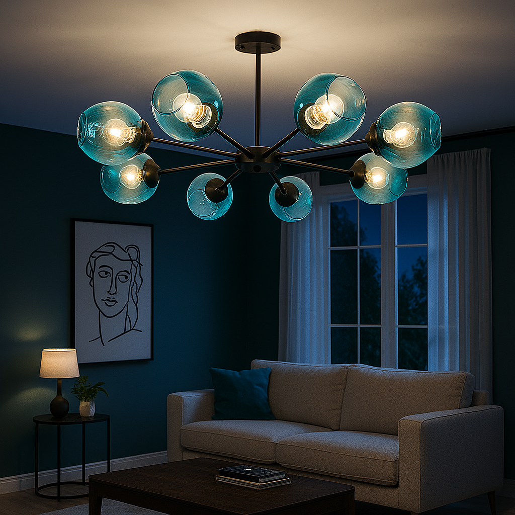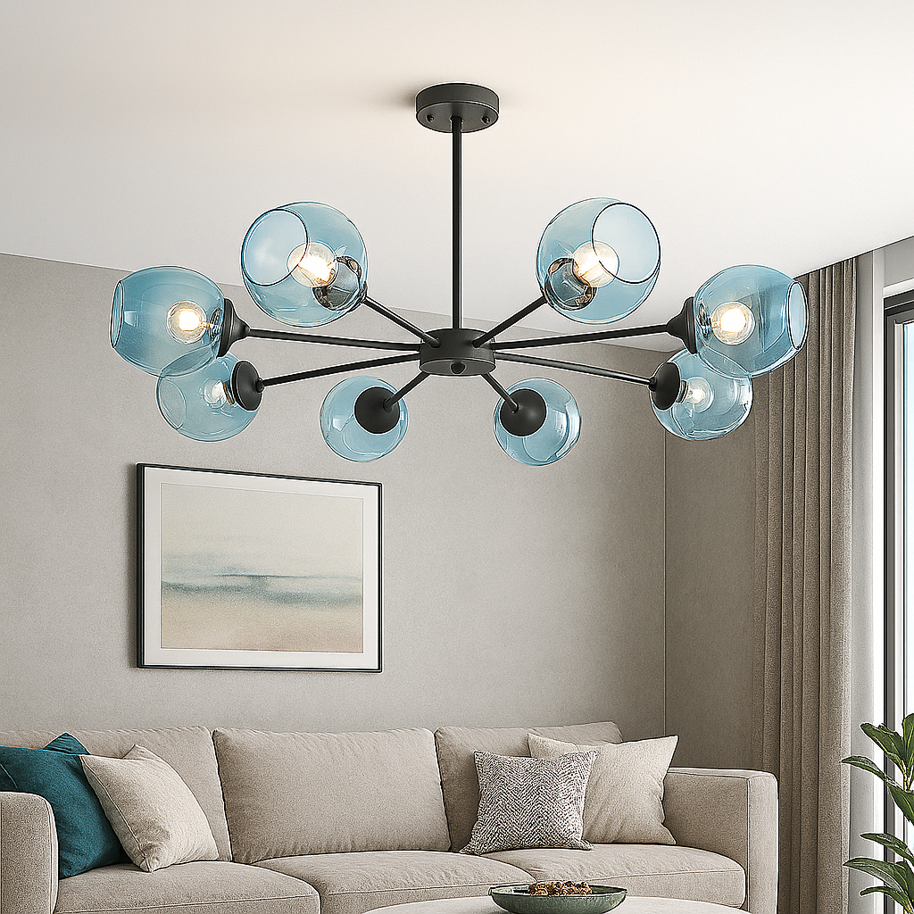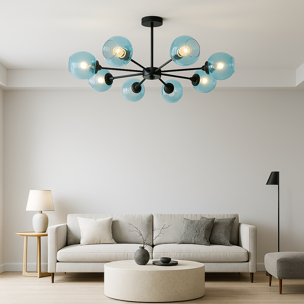 Izrađen od kvalitetnog metala i stakla, u kombinaciji crne i plave boje, ovaj model donosi savremeni estetski dojam uz dugotrajnu izdržljivost. Njegov sputnik dizajn sa 8 E27 grla omogućava ravnomjerno osvjetljenje i stvaranje prijatne atmosfere u svakoj prostoriji.