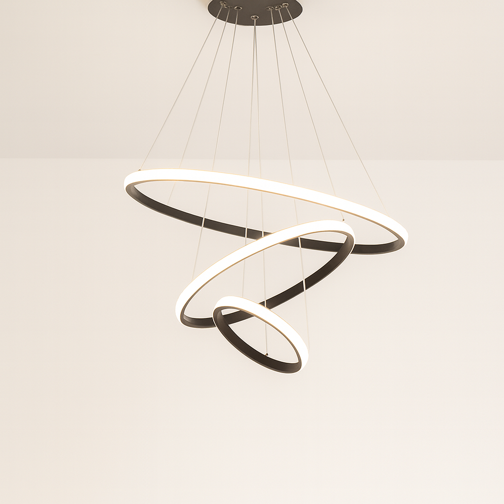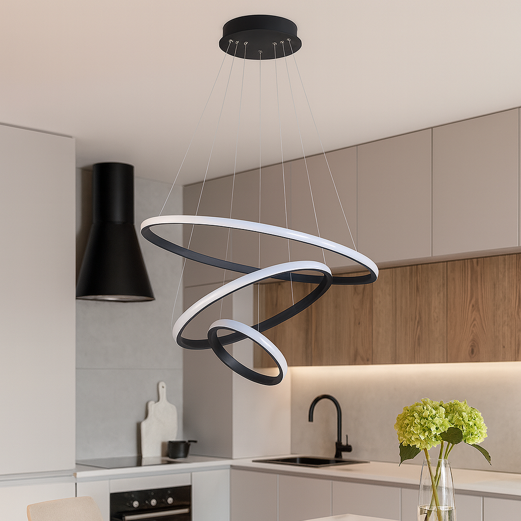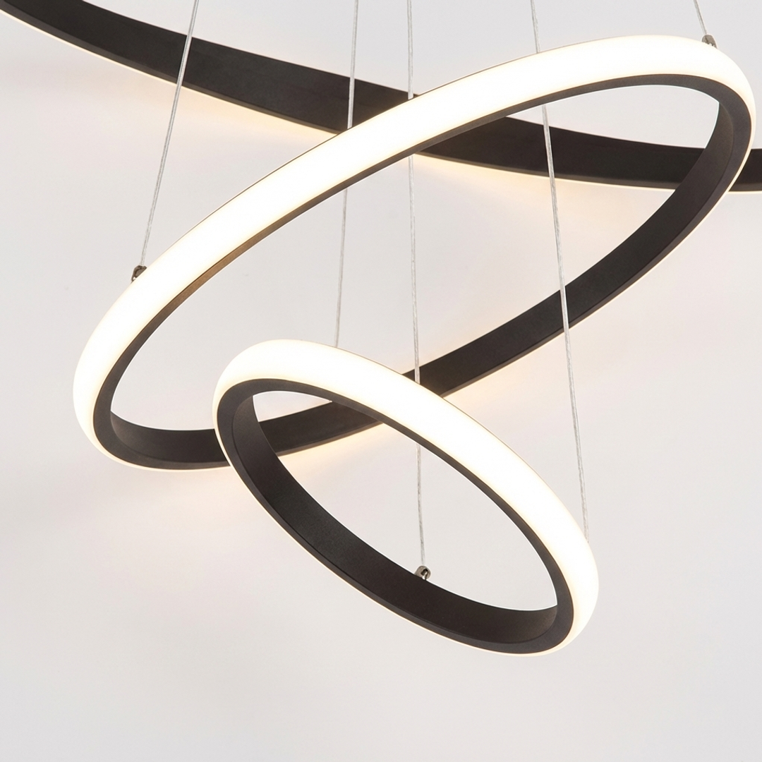 Unesite moderan i luksuzan izgled u vaš dom uz LED viseći luster PENDANT LIGHT D8033-40+60+80B-D. Ovaj impozantan model sa tri crna prstena različitih dimenzija izrađen je od metala i silikona, te nudi snažnu i ravnomjernu svjetlost sa mogućnošću podešavanja jačine (dimmable).