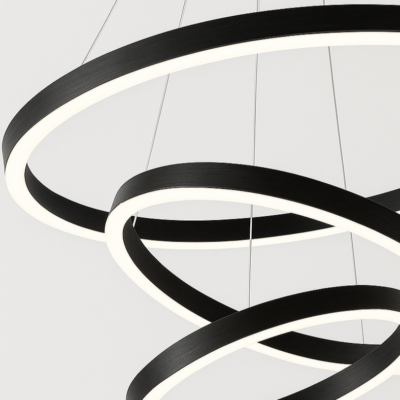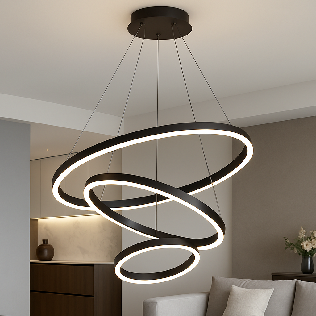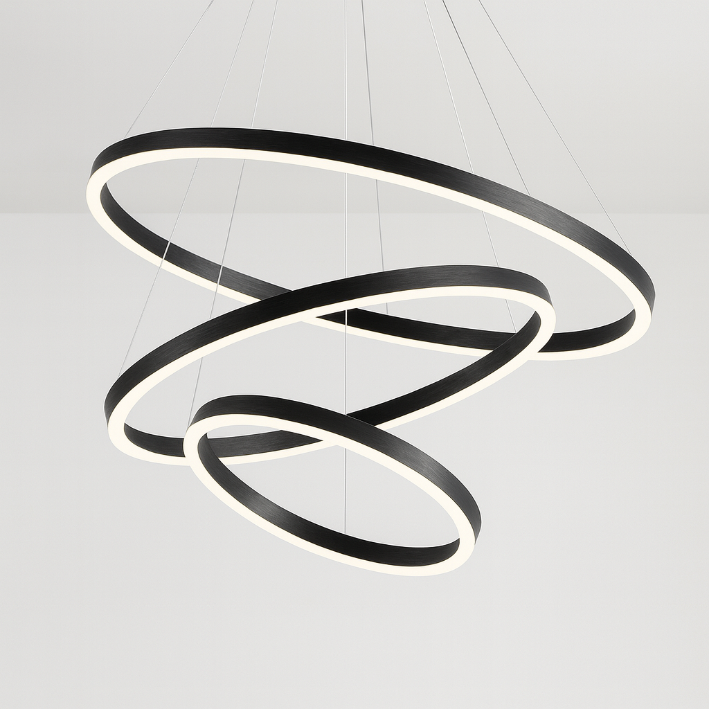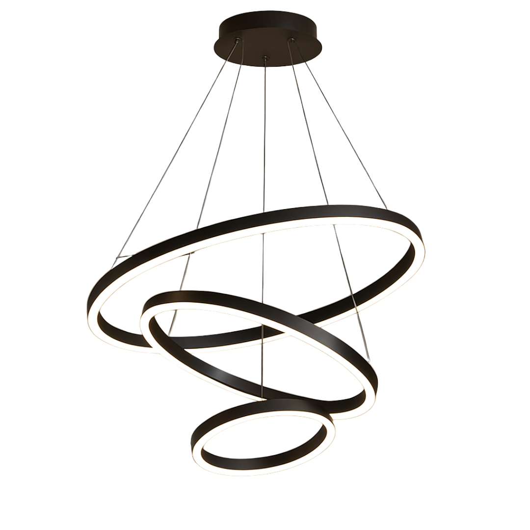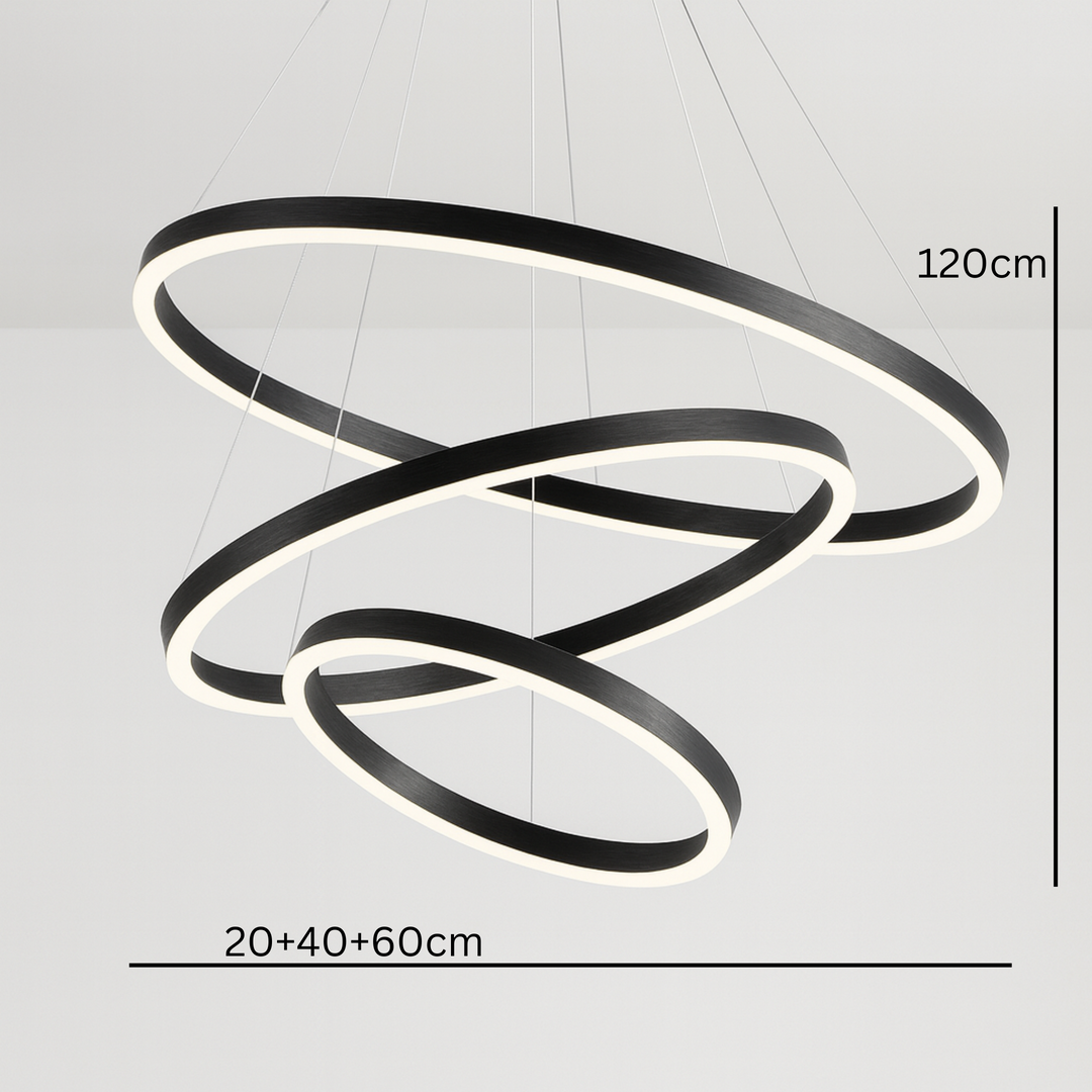 Dodajte moderan i luksuzan izgled svom domu uz LED viseći luster PENDANT LIGHT D8034-20+40+60B. Ovaj atraktivni model sa tri crna prstena različitih dimenzija (Ø20 cm, Ø40 cm i Ø60 cm) izrađen je od aluminija i akrila, nudeći upečatljiv dizajn i mogućnost podešavanja u 3 boje svjetla (topla, neutralna, hladna).