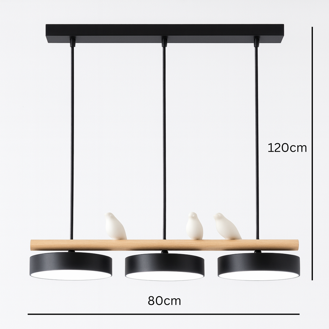 Dimenzije D80*V120cm i podesive žice omogućavaju prilagođavanje visine, dok crna boja i dekorativni detalji (poput minimalističkih figura ptica) čine ovaj model upečatljivim centralnim elementom prostora.
