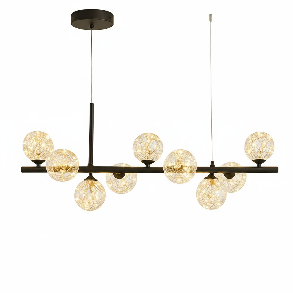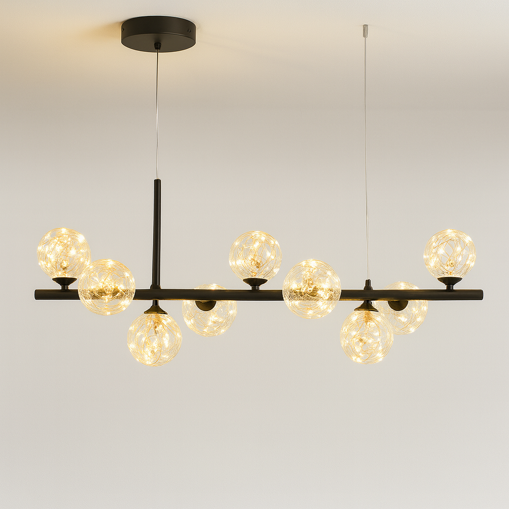 Crna konstrukcija u kombinaciji sa providnim staklenim kuglama stvara prefinjen izgled i impresivan svjetlosni efekat. Integrisano LED osvjetljenje snage 54W pruža optimalnu svjetlinu uz energetsku efikasnost i dug vijek trajanja.