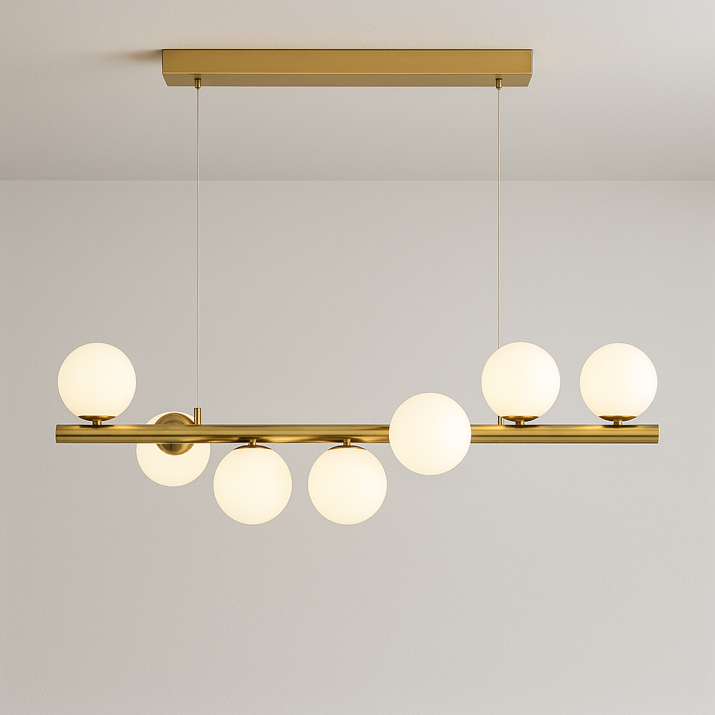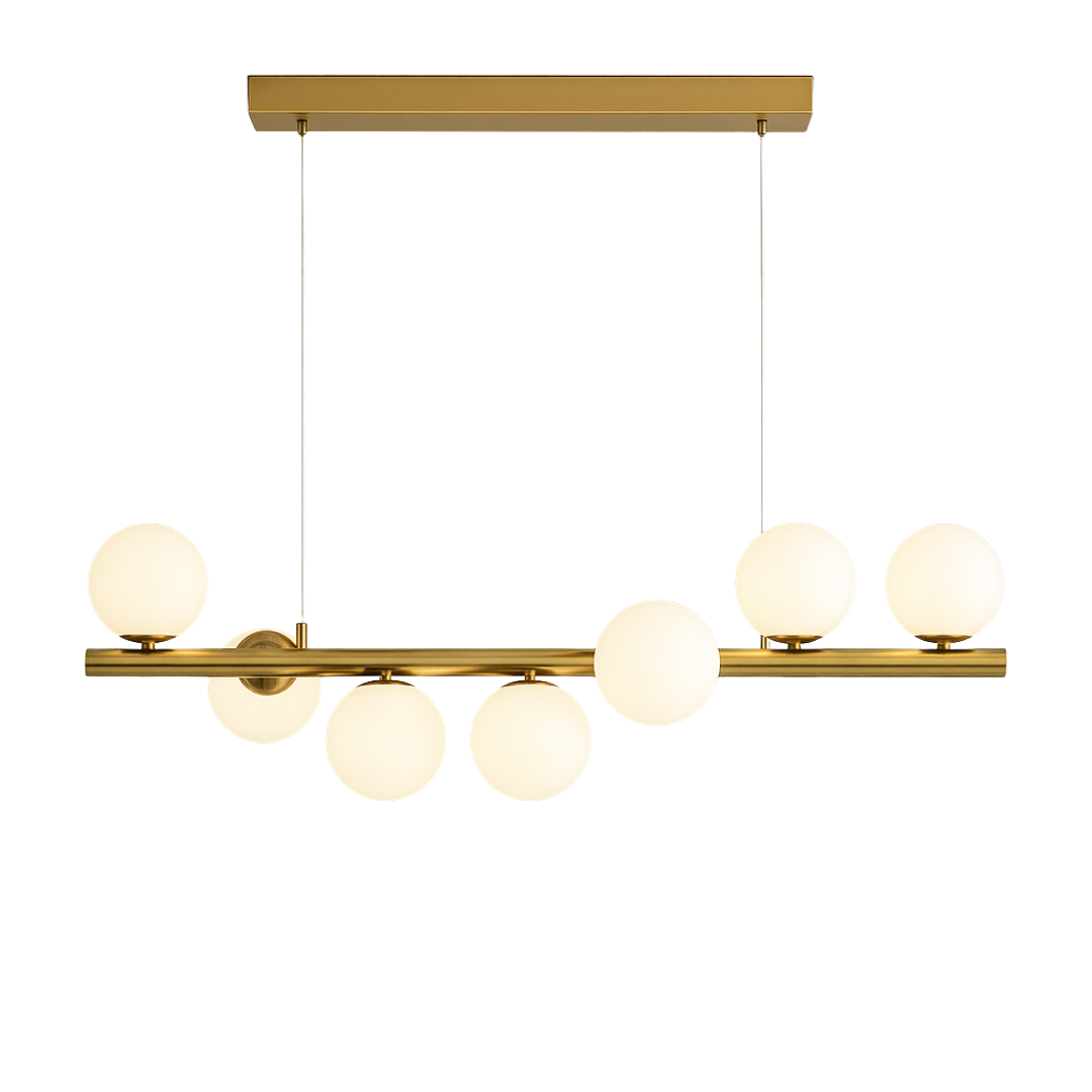 Zlatna struktura u kombinaciji sa mliječno–bijelim staklenim abažurima donosi osjećaj luksuza i mekoće svjetla. Luster koristi 7 G9 sijalica (nisu uključene), koje pružaju dovoljno svjetlosti za ugodnu atmosferu.