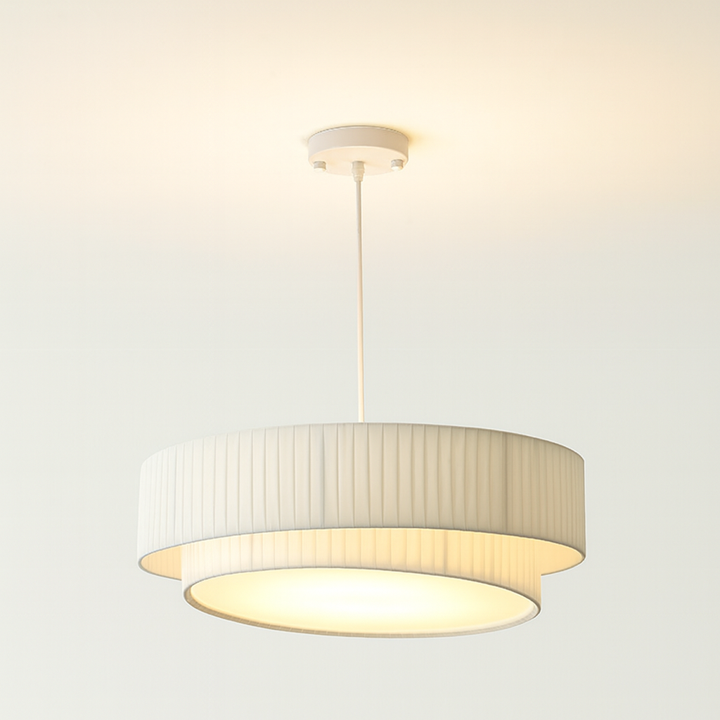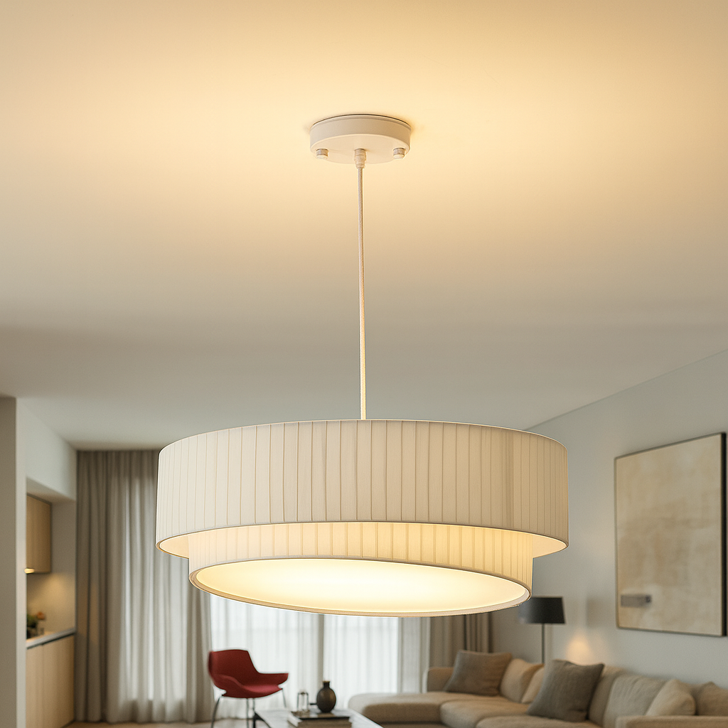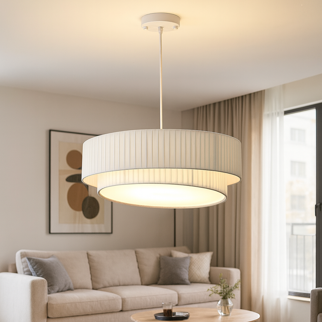 Bijela tkanina ravnomjerno difuzuje svjetlost, dok podesiva visina omogućava idealno pozicioniranje iznad trpezarijskog stola, u dnevnoj sobi ili hodniku.
