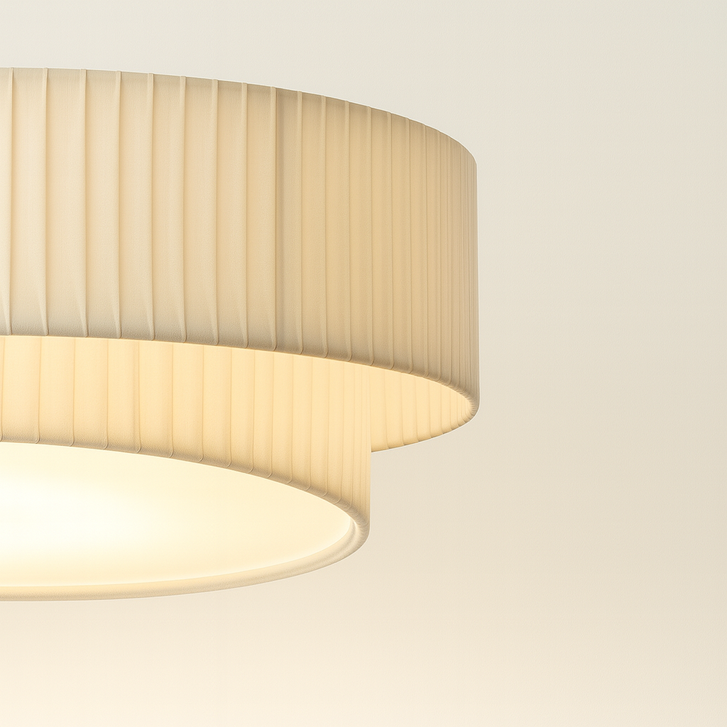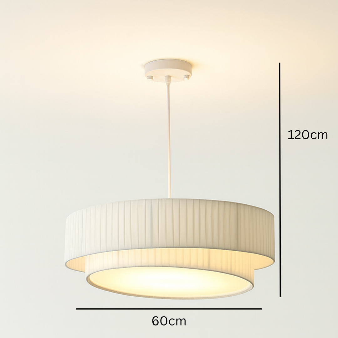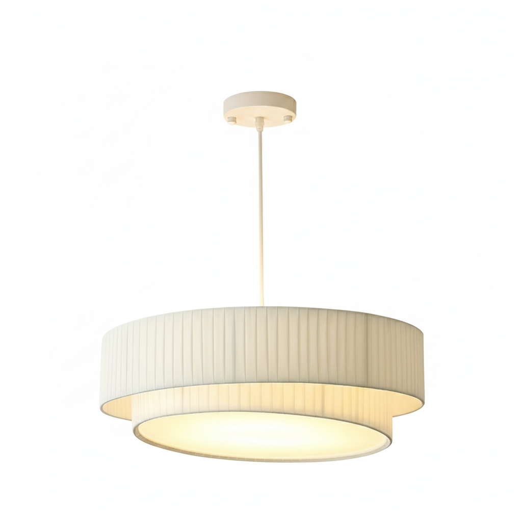 Bijela tkanina ravnomjerno difuzuje svjetlost, dok podesiva visina omogućava idealno pozicioniranje iznad trpezarijskog stola, u dnevnoj sobi ili hodniku.