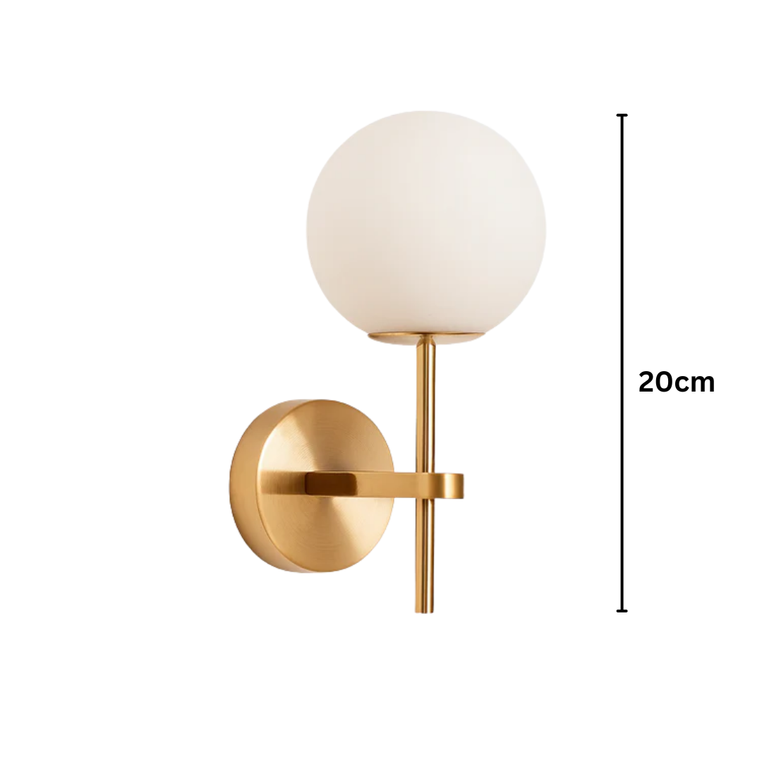 Zidna lampa B6003/1 savršen je spoj elegancije i minimalizma, idealna za moderne enterijere kojima želite dodati toplinu i sofisticiranost. Sa zlatnim metalnim tijelom i mliječnobijelim staklenim sjenilom u obliku kugle, ova lampa donosi luksuzni vizualni dojam, bilo da je koristite kao ambijentalnu rasvjetu u dnevnoj sobi, spavaćoj sobi ili hodniku.