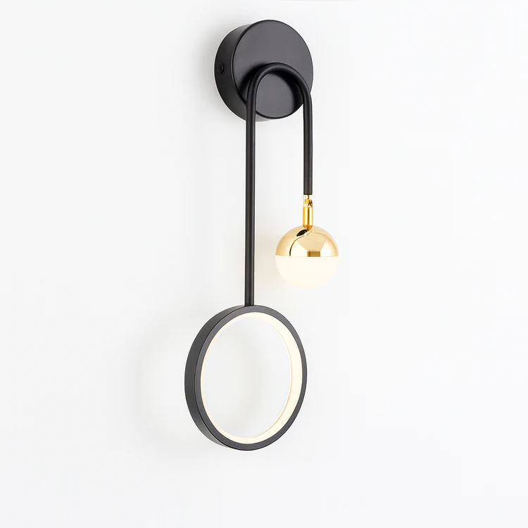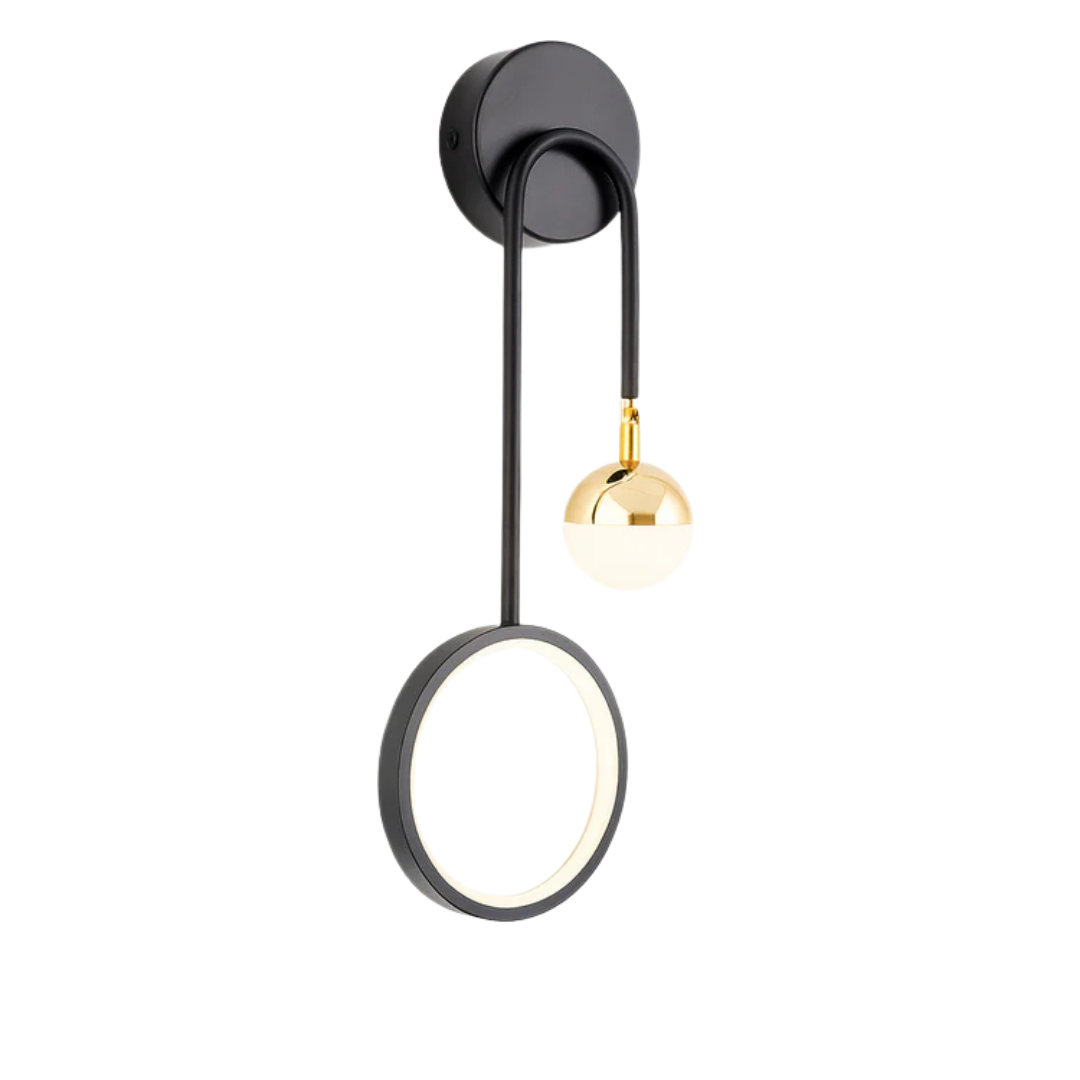 Sa dimenzijama D17 x H50 cm, lampa sadrži jedinstveni kružni LED prsten koji emituje prijatnu ambijentalnu svjetlost, dok zlatna sfera na vrhu dodaje dinamiku i eleganciju.