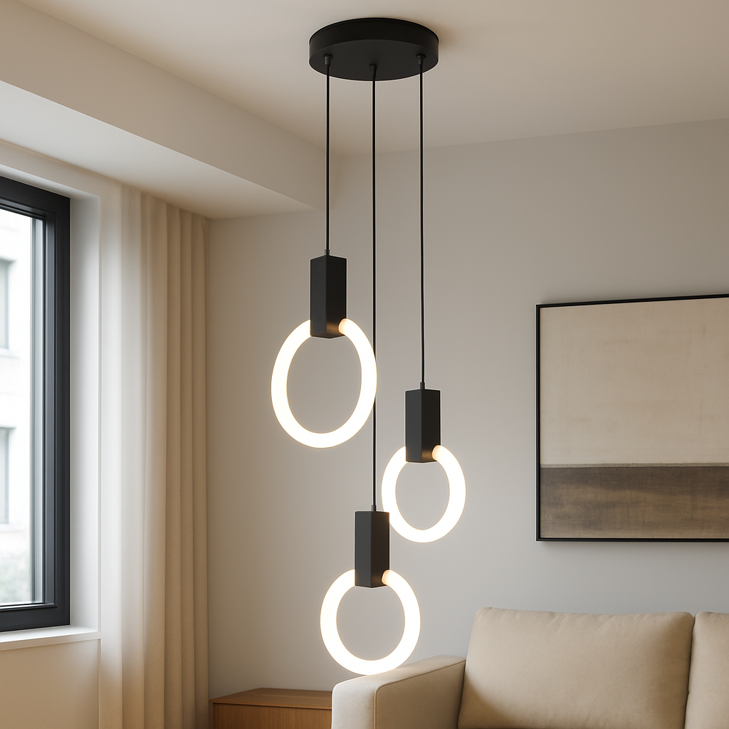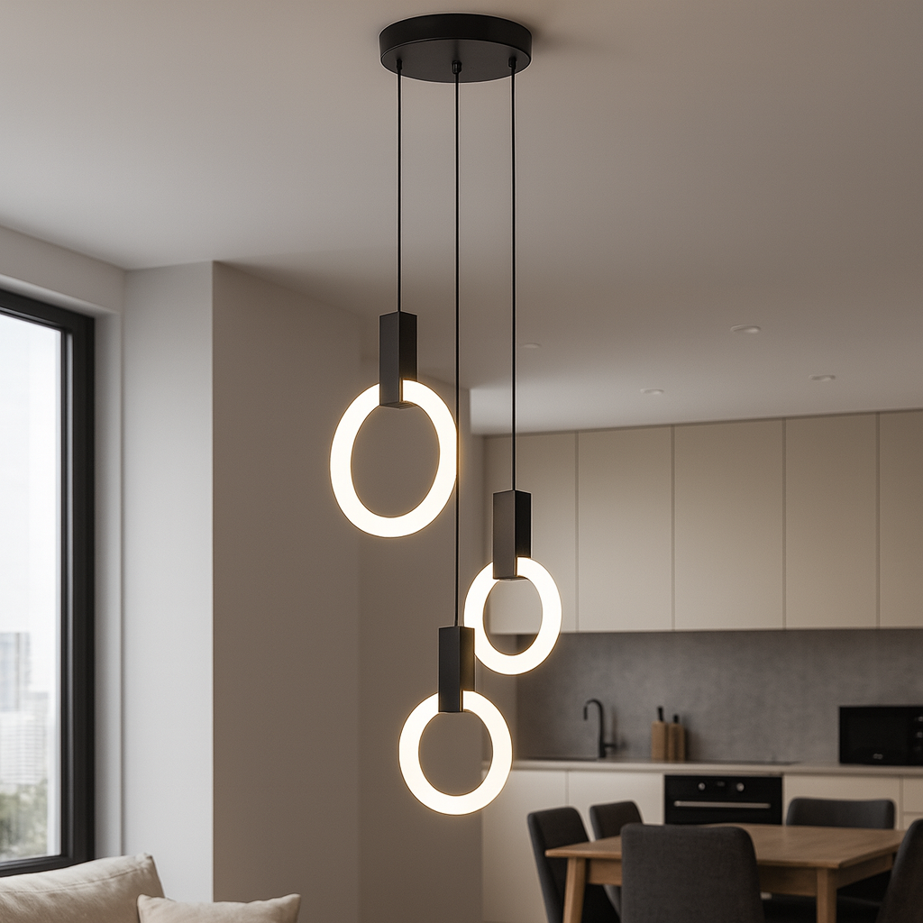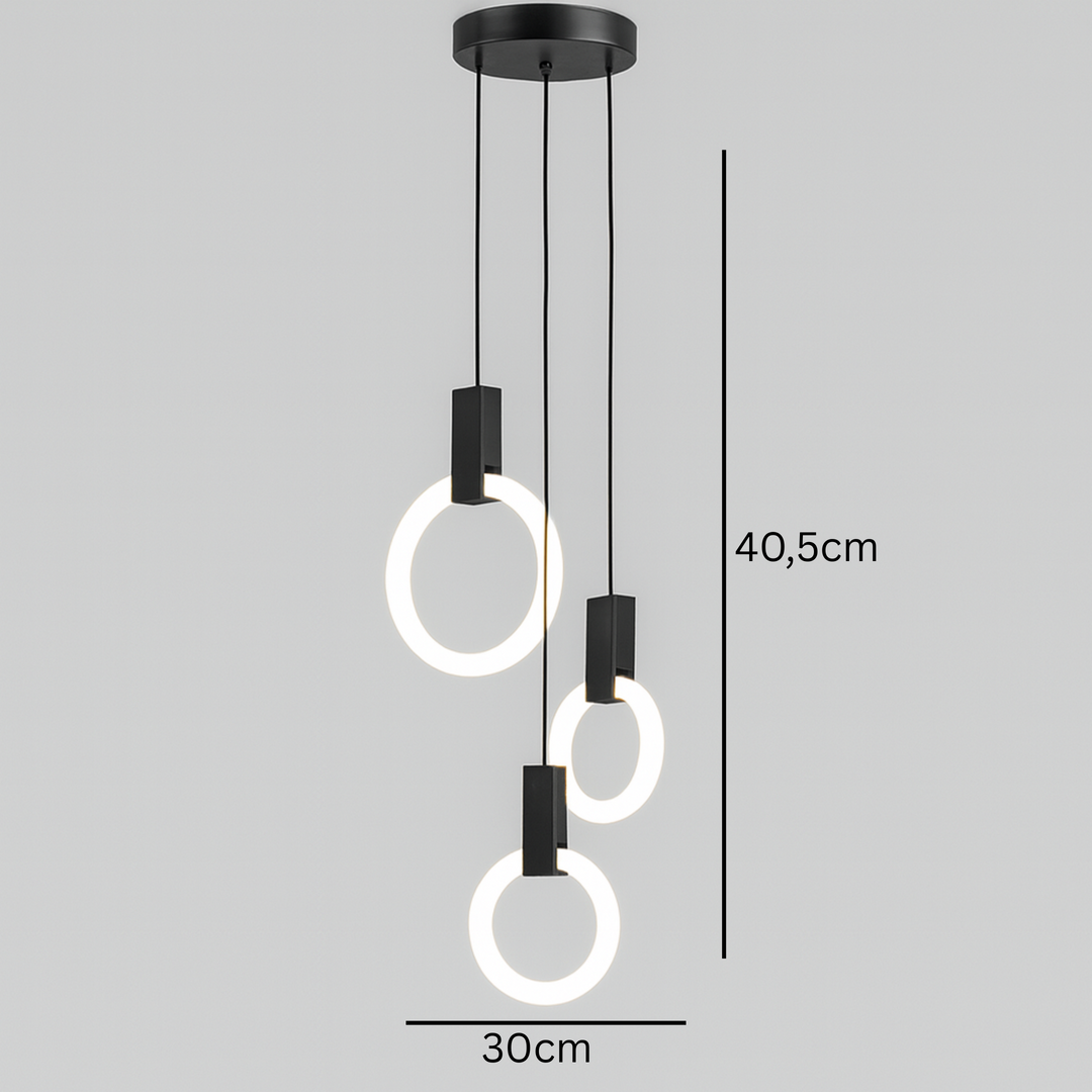 Sa dimenzijama D30 × V40,5 cm i podesivim kablom do 1,5 m, lako se prilagođava visini prostora. Opremljen je integrisanim LED svjetlom snage 16W, koje pruža snažno, energetski efikasno i ravnomjerno osvjetljenje – idealno za dnevne sobe, trpezarije, kuhinjske šankove ili kancelarije.