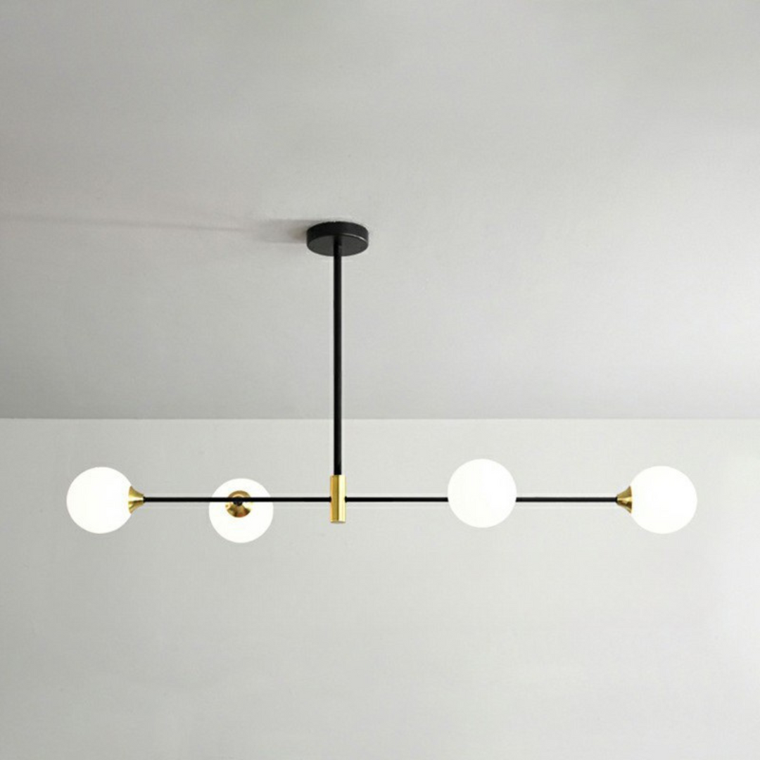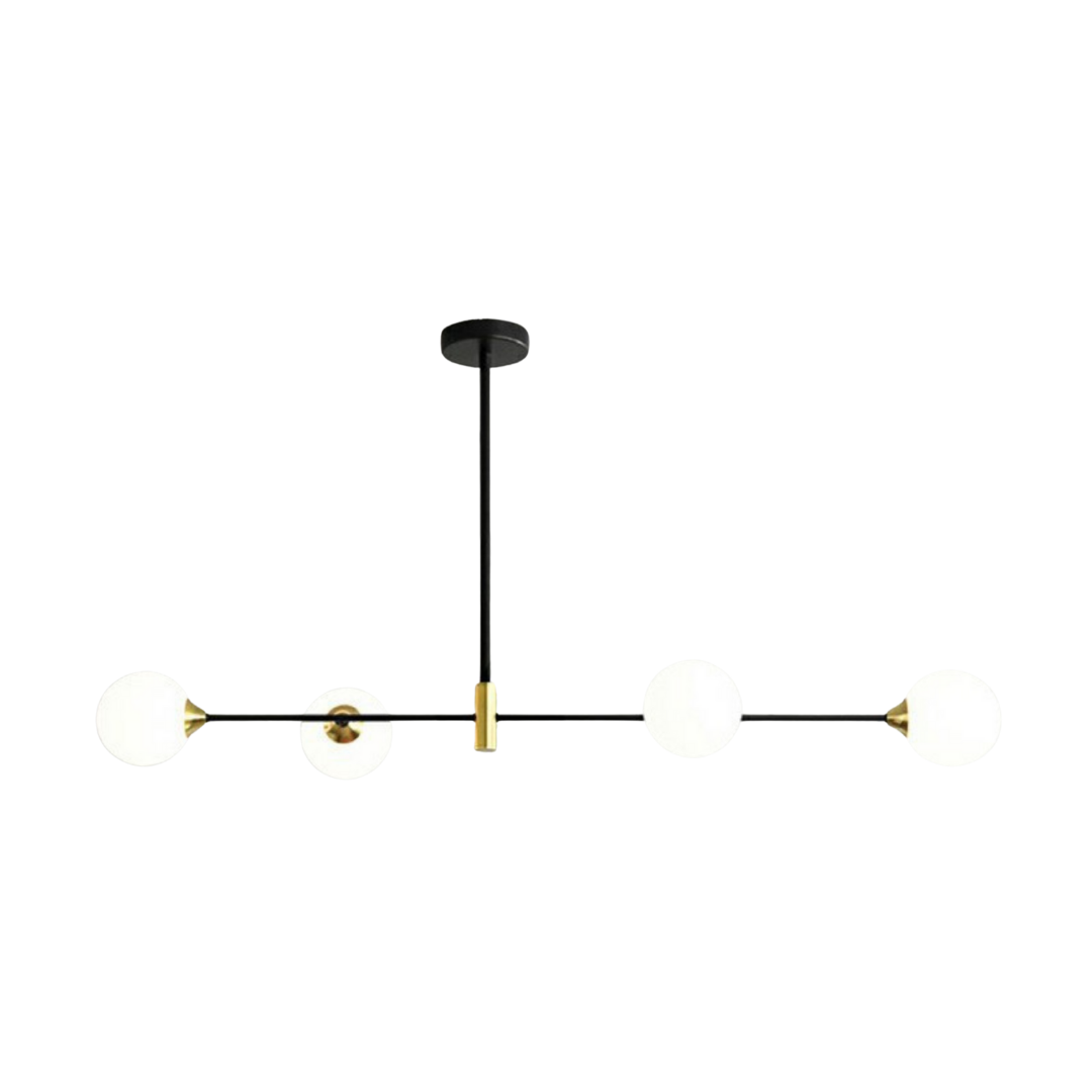 Sa dimenzijama 100 cm dužine, 12 cm širine i 23 cm visine, luster se lako uklapa u razne tipove prostora, donoseći savršen balans funkcionalnosti i estetike. Crna konstrukcija u kontrastu s mliječno-bijelim staklenim kuglama pruža meko, toplo osvjetljenje. Koristi 4 G9 sijalice (nisu uključene) koje pružaju dovoljno svjetla i ugodnu atmosferu.