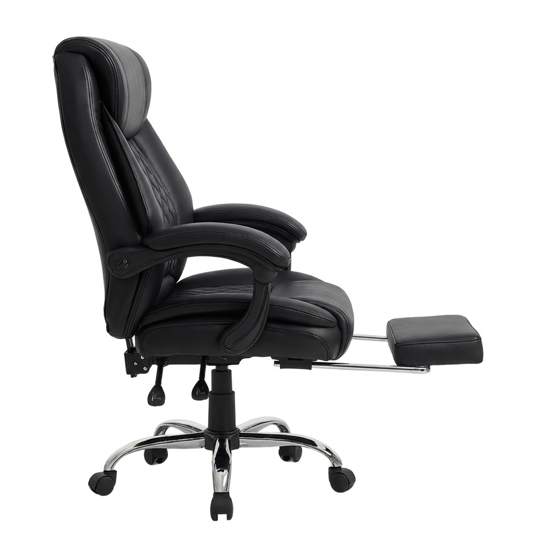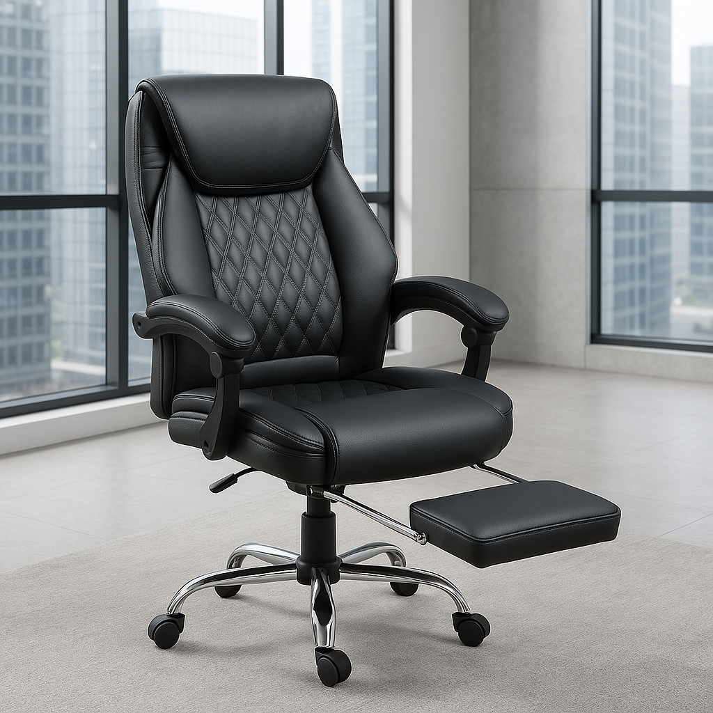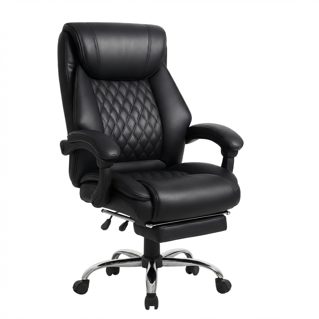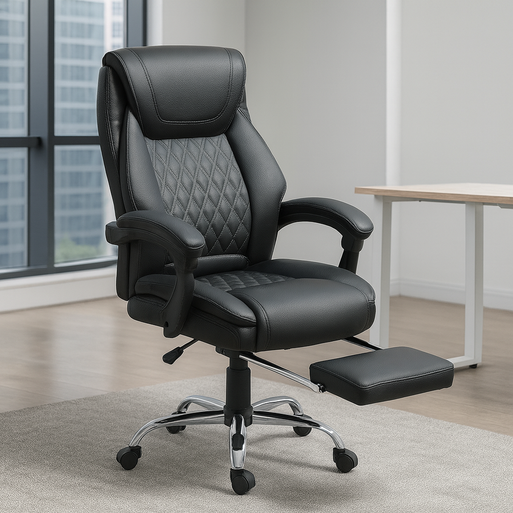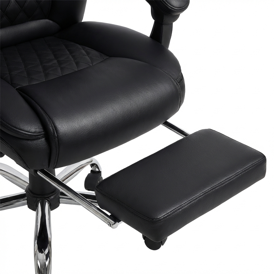 Izrađena od visokokvalitetne eko-kože u elegantnoj crnoj boji, Konna stolica sadrži prošiveni naslon s dijamantskim šarama, mekano podstavljene naslone za ruke i izvlačivi oslonac za noge za potpunu relaksaciju. Podesiva visina, zakretni mehanizam od 360 stepeni i stabilna hromirana baza sa točkićima omogućavaju lako kretanje i fleksibilnost u svakodnevnom radu.