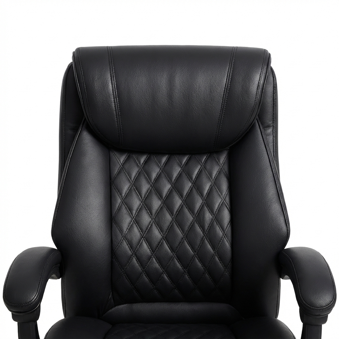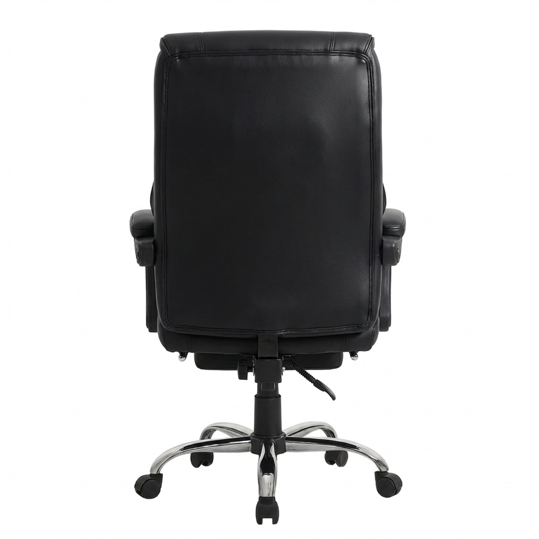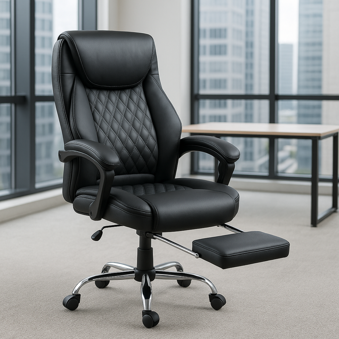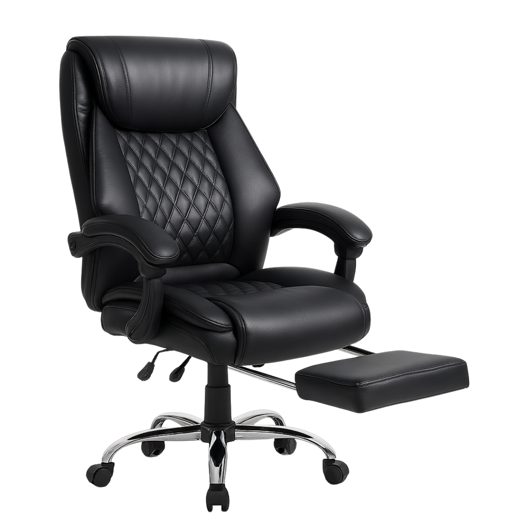 Izrađena od visokokvalitetne eko-kože u elegantnoj crnoj boji, Konna stolica sadrži prošiveni naslon s dijamantskim šarama, mekano podstavljene naslone za ruke i izvlačivi oslonac za noge za potpunu relaksaciju. Podesiva visina, zakretni mehanizam od 360 stepeni i stabilna hromirana baza sa točkićima omogućavaju lako kretanje i fleksibilnost u svakodnevnom radu.
