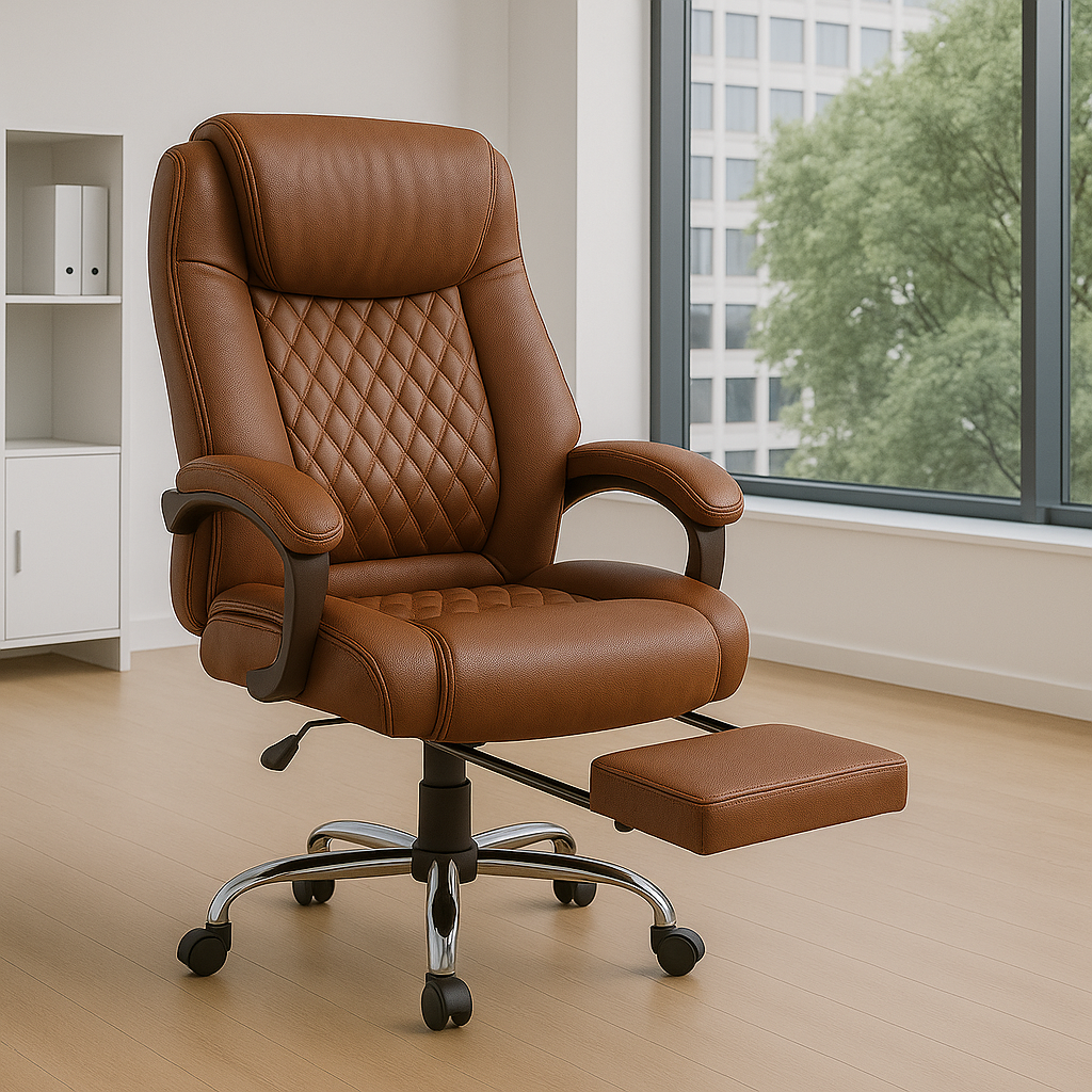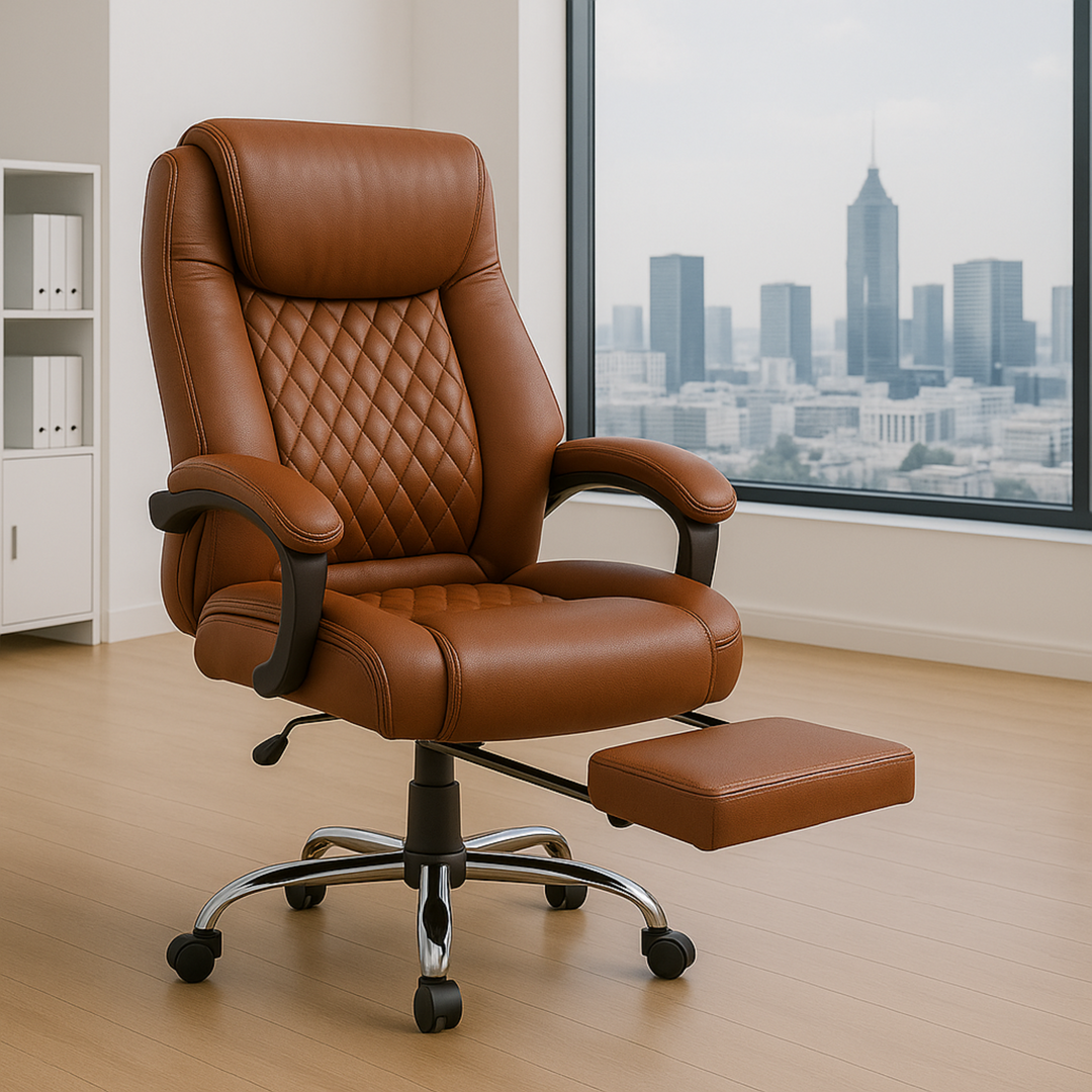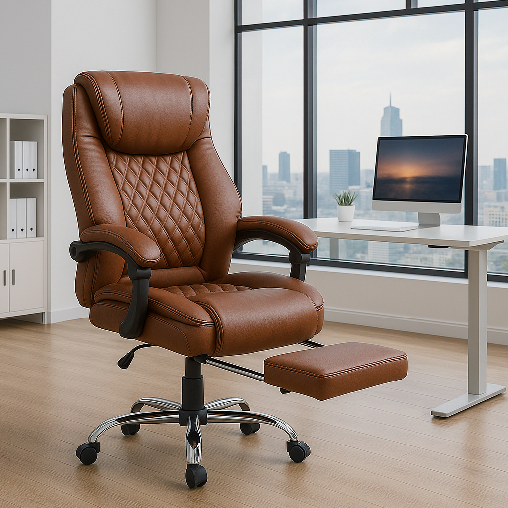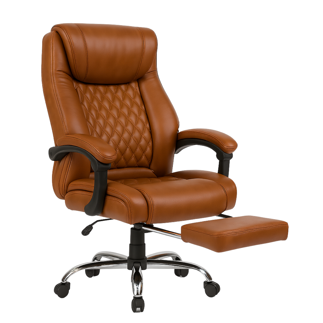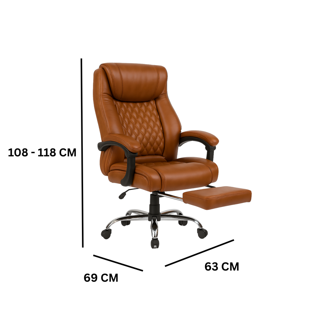 Izrađena od visokokvalitetne eko-kože u elegantnoj smeđoj boji, Konna stolica sadrži prošiveni naslon s dijamantskim šarama, mekano podstavljene naslone za ruke i izvlačivi oslonac za noge za potpunu relaksaciju. Podesiva visina, zakretni mehanizam od 360 stepeni i stabilna hromirana baza sa točkićima omogućavaju lako kretanje i fleksibilnost u svakodnevnom radu.