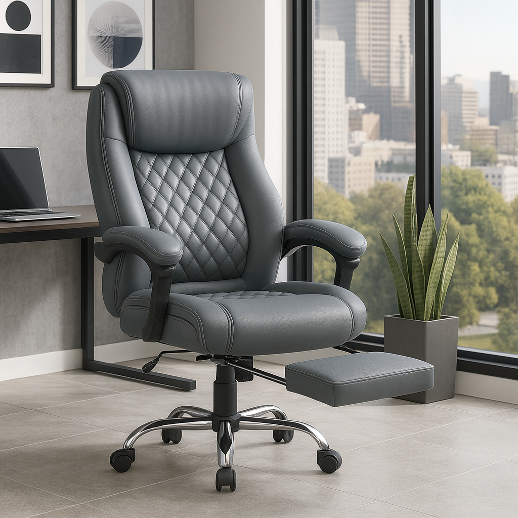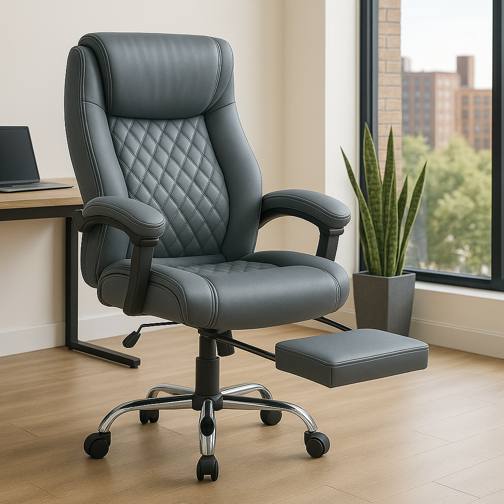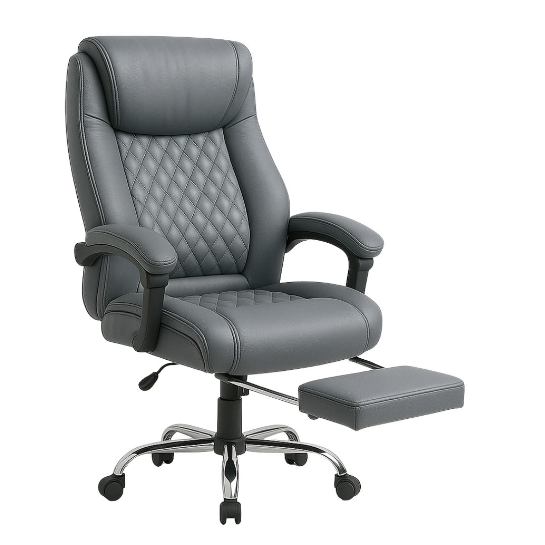 Izrađena od visokokvalitetne eko-kože u elegantnoj sivoj boji, Konna stolica sadrži prošiveni naslon s dijamantskim šarama, mekano podstavljene naslone za ruke i izvlačivi oslonac za noge za potpunu relaksaciju. Podesiva visina, zakretni mehanizam od 360 stepeni i stabilna hromirana baza sa točkićima omogućavaju lako kretanje i fleksibilnost u svakodnevnom radu.