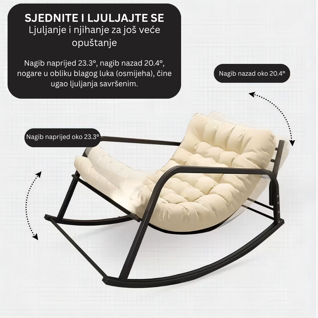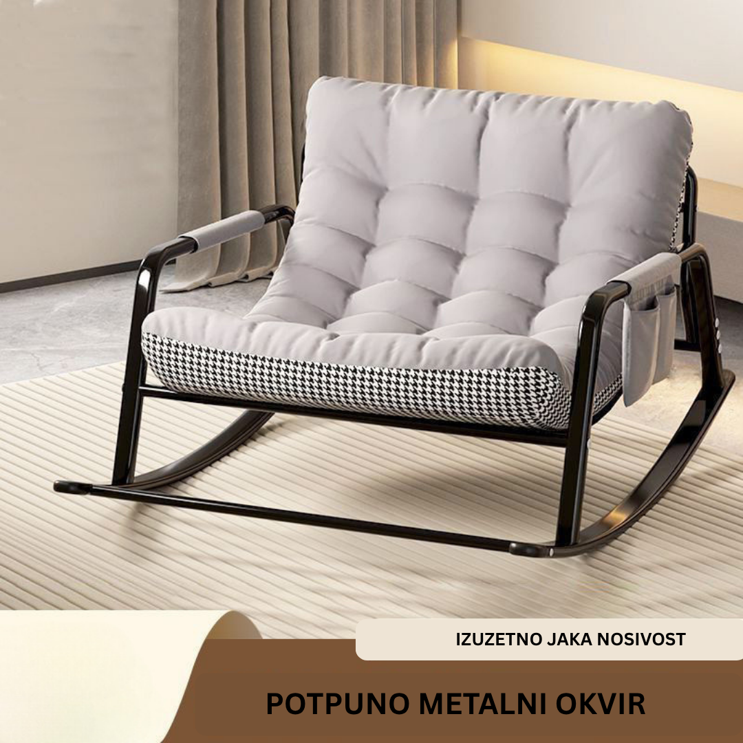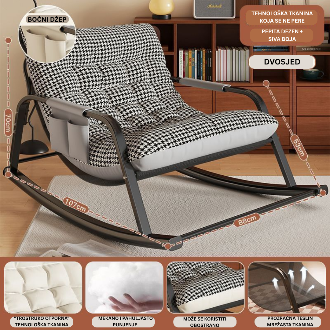 Uživajte u nježnom ljuljanju dok čitate knjigu, gledate omiljeni film ili uspavljujete bebu. Presvučena mekom i luksuznom baršunastom tkaninom, ne samo da izgleda elegantno, već je i izuzetno izdržljiva i otporna na mrlje, što je čini savršenom za svakodnevnu upotrebu. Gusto pjenasto punjenje pruža superiornu udobnost i podršku, dok vertikalni proštepi i elegantni rubovi dodaju notu sofisticiranosti.