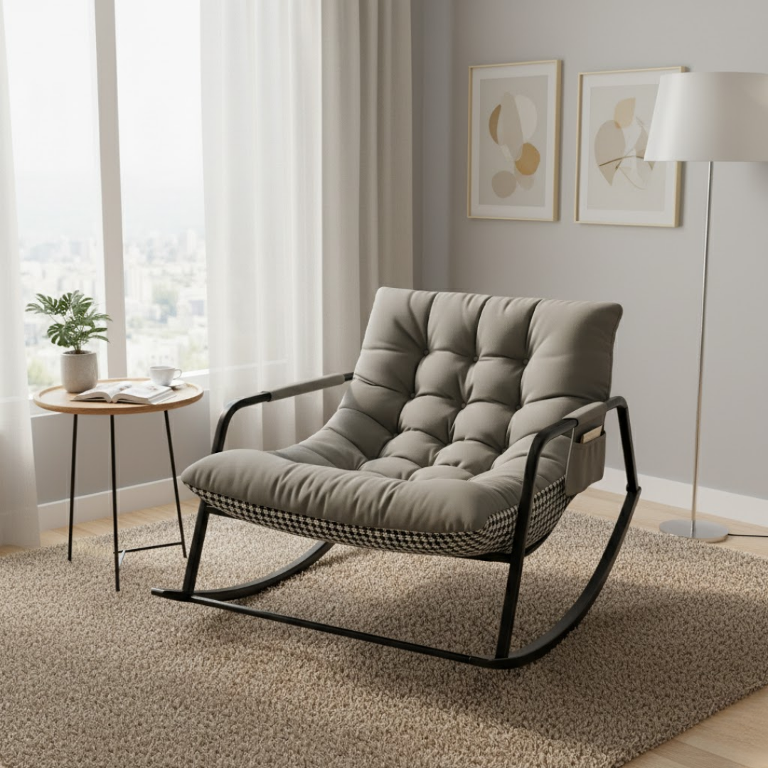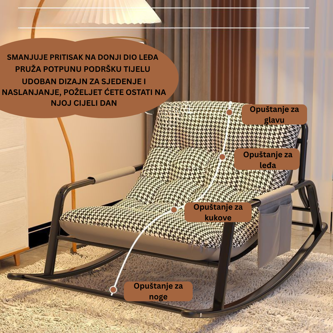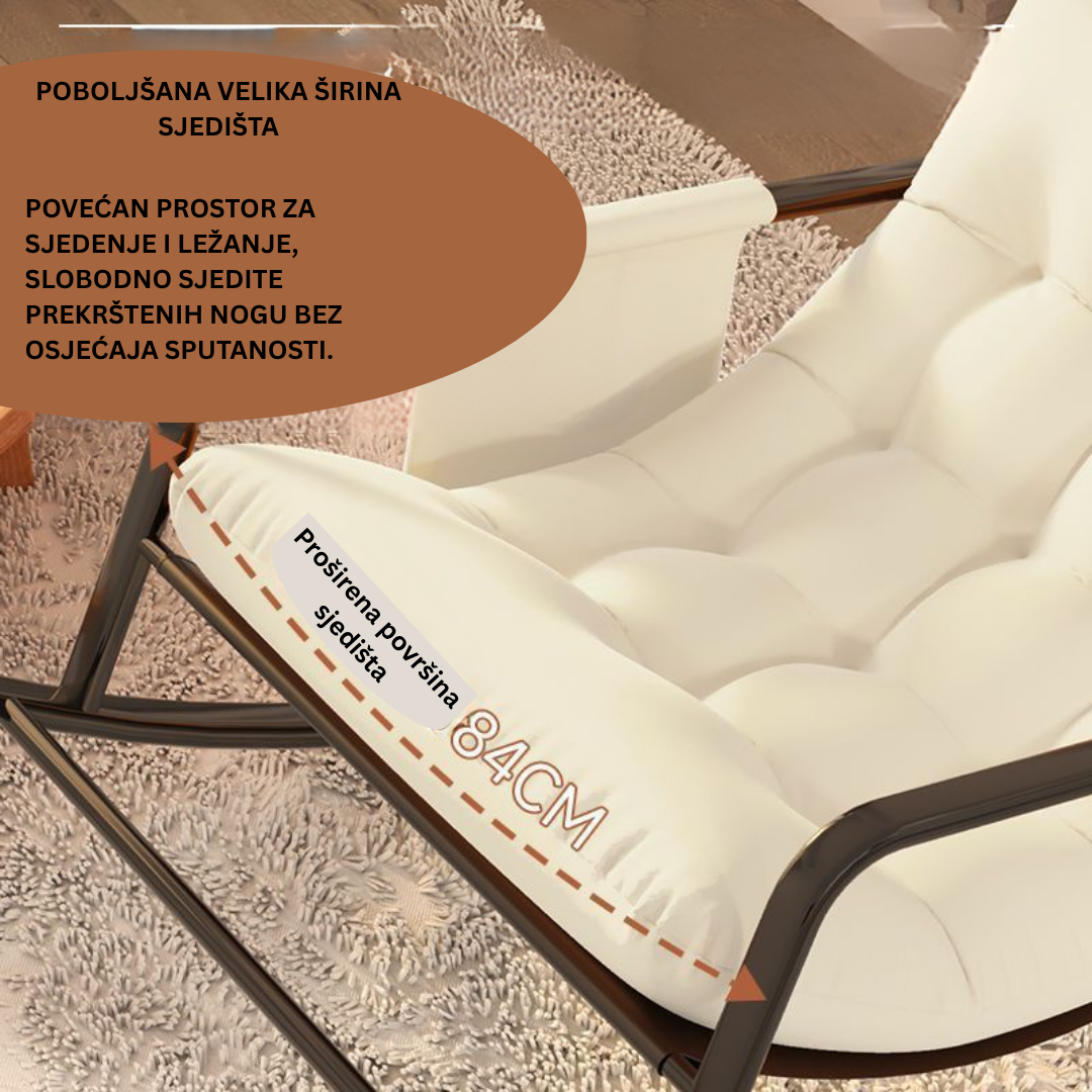 Uživajte u nježnom ljuljanju dok čitate knjigu, gledate omiljeni film ili uspavljujete bebu. Presvučena mekom i luksuznom baršunastom tkaninom, ne samo da izgleda elegantno, već je i izuzetno izdržljiva i otporna na mrlje, što je čini savršenom za svakodnevnu upotrebu. Gusto pjenasto punjenje pruža superiornu udobnost i podršku, dok vertikalni proštepi i elegantni rubovi dodaju notu sofisticiranosti.