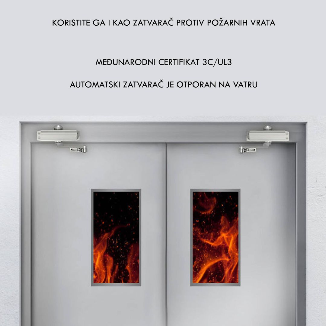 Protivpožarna Sigurnost: Proizvod je atestiran međunarodnim certifikatom 3C/UL3 i automatski zatvarač je otporan na vatru, što ga čini savršenim za ugradnju na protivpožarna vrata.