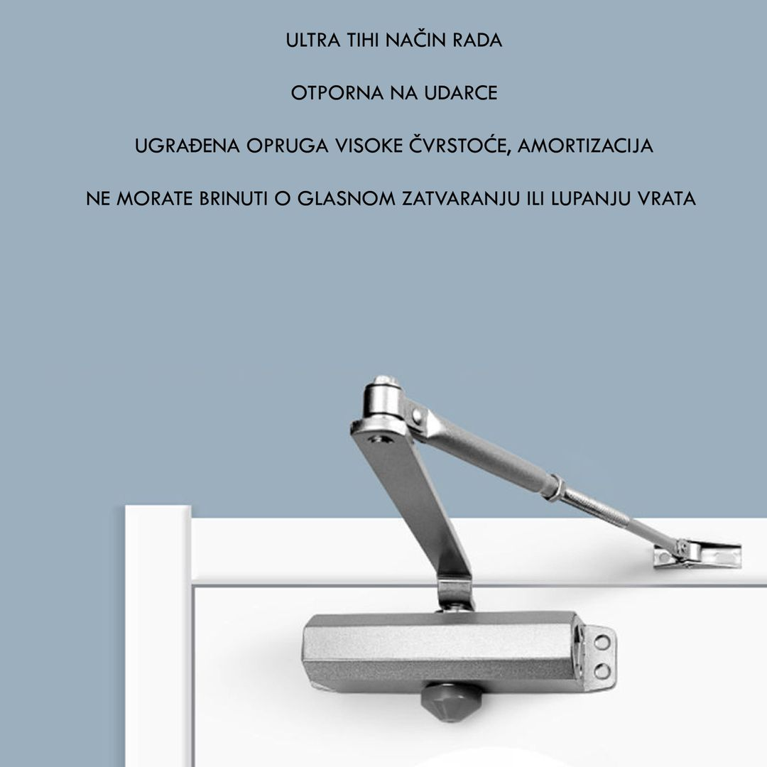 Ovaj vrhunski automatski zatvarač za vrata je esencijalno rješenje za sigurno, tiho i kontrolirano zatvaranje. Izrađen od visokokvalitetne aluminijske legure s jezgrom od kaljenog ugljeničnog čelika, nudi pouzdanost i dugotrajnost, čak i u ekstremnim uvjetima. Posebno je dizajniran da služi i kao zatvarač za protivpožarna vrata, posjedujući međunarodni certifikat 3C/UL3, čineći ga otpornim na vatru. Uz ultra-tihi rad i dvostupanjsko hidraulično podešavanje brzine, nikada se više nećete brinuti o glasnom lupanju vrata.