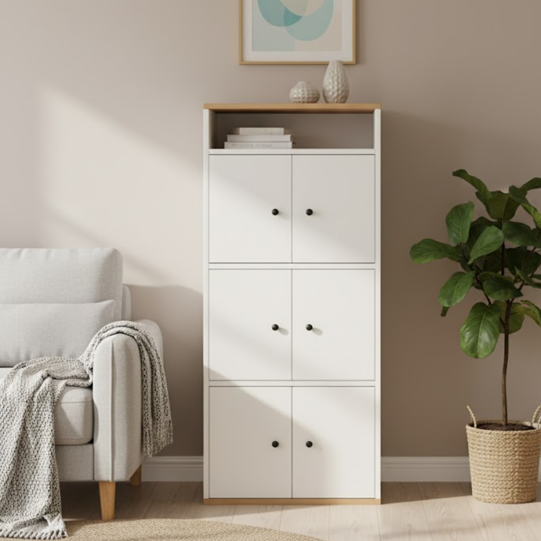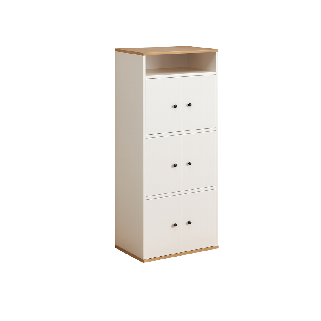 Trebate više prostora, a imate ograničen kutak u sobi? Arrango u svojoj višoj varijanti nudi savršeno rješenje za vertikalno odlaganje. Sa svojim modernim, čistim dizajnom i kombinacijom bijele boje te detalja u boji drveta, ovaj ormarić pretvara neiskorištene kutove u funkcionalne zone za pohranu.
