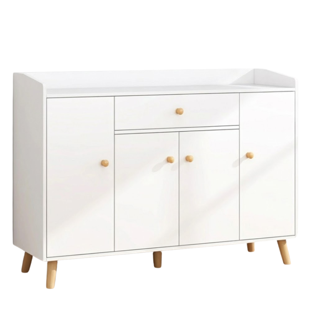 Kvalitetna izrada: Napravljen od podebljanih ploča koje osiguravaju stabilnost i dugotrajnost. Ručkice od drveta dodaju toplinu minimalističkom bijelom dizajnu.