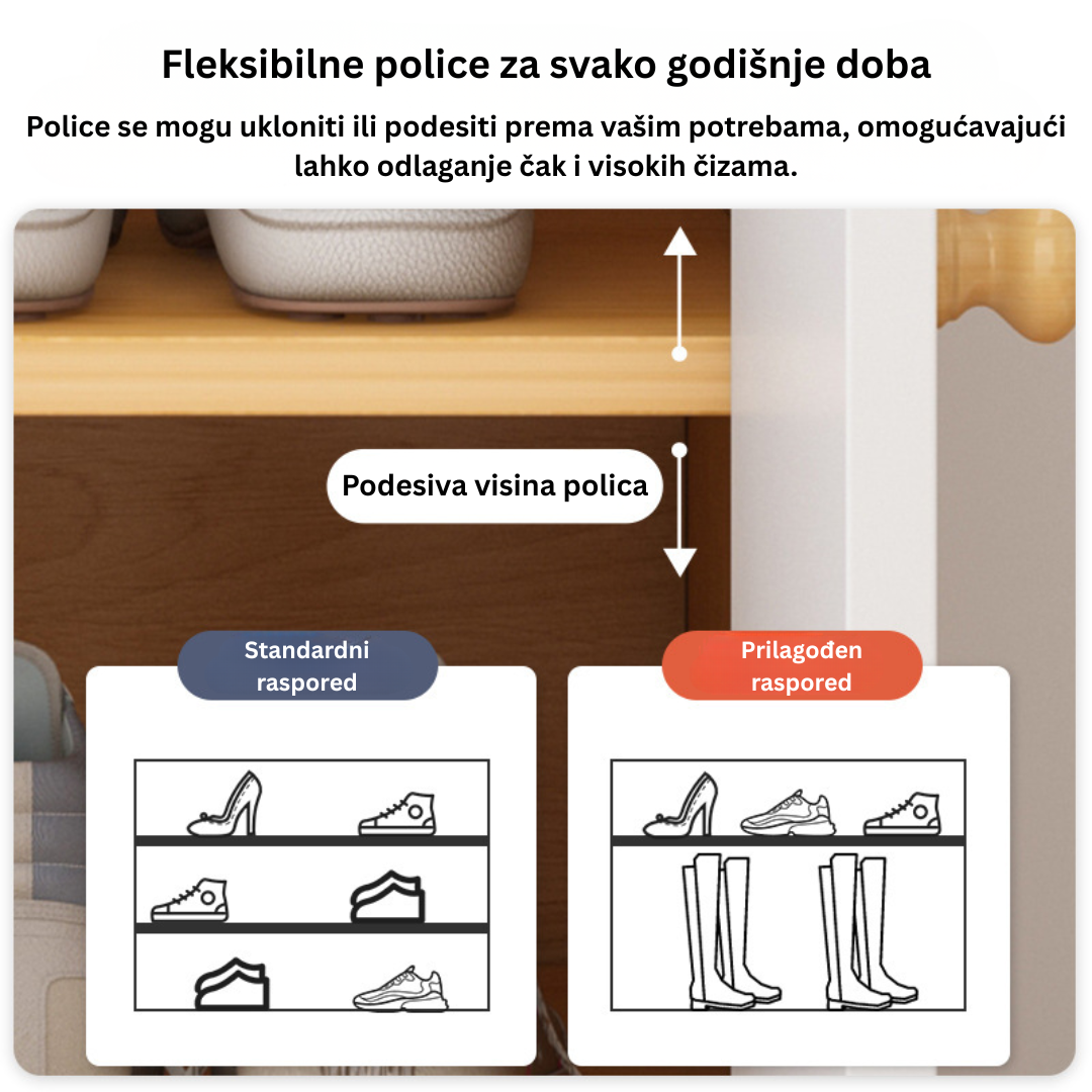 Fleksibilne i podesive police: Unutrašnje police se mogu prilagoditi ili potpuno ukloniti. Ovo vam omogućava da pohranite sve vrste obuće – od niskih patika i cipela do visokih zimskih čizama.