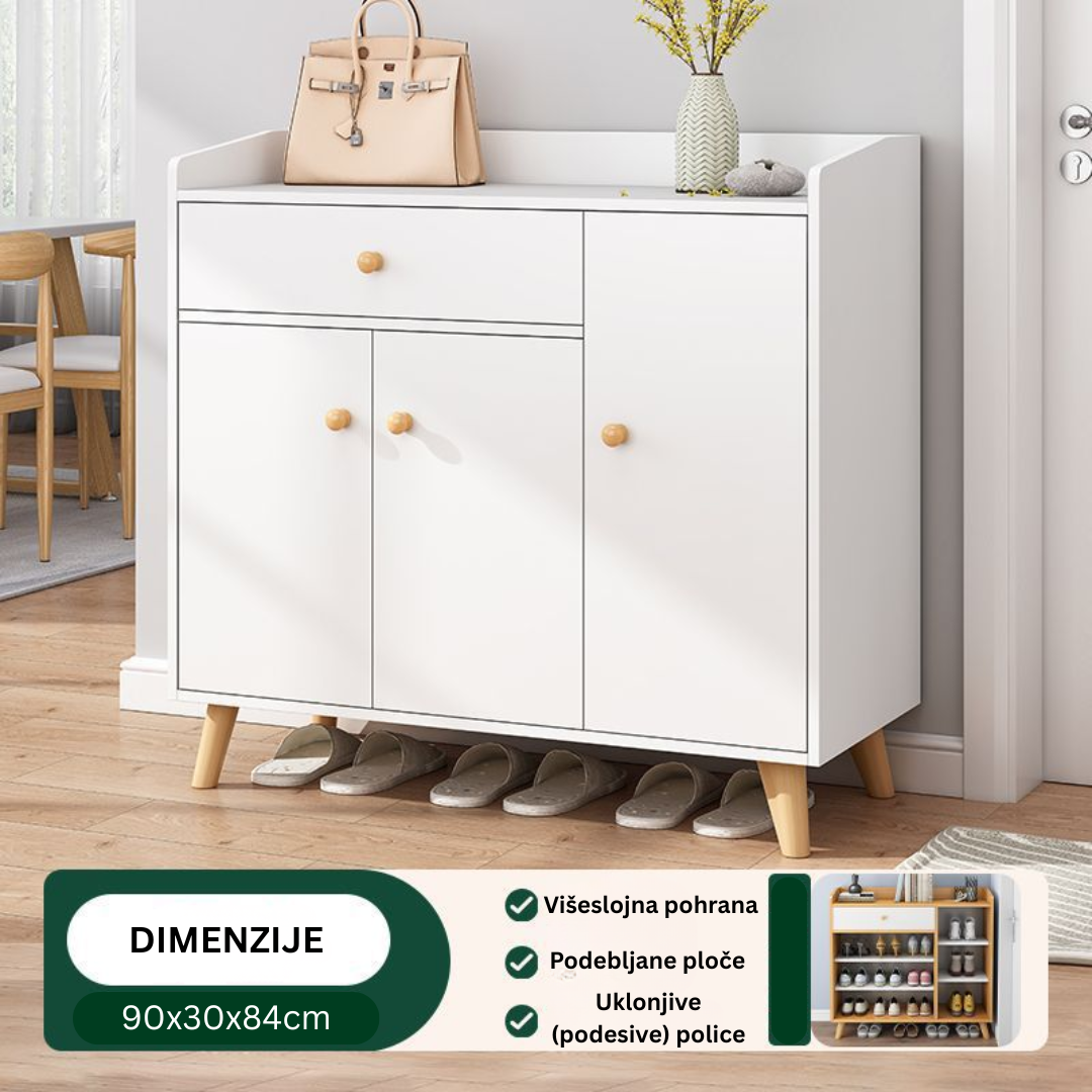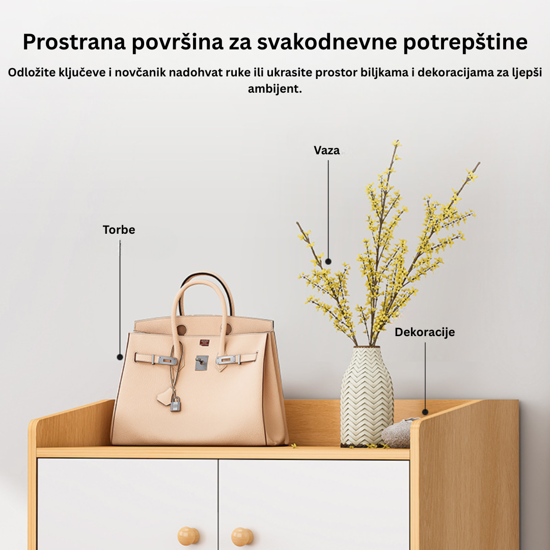 Fleksibilna unutrašnjost: Police unutar ormarića su uklonjive i podesive, omogućujući vam da prilagodite visinu pretinaca za visoke čizme ili niske tenisice.