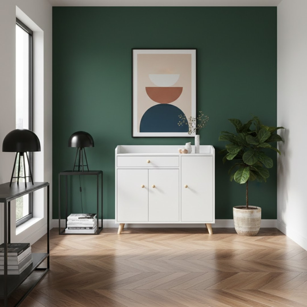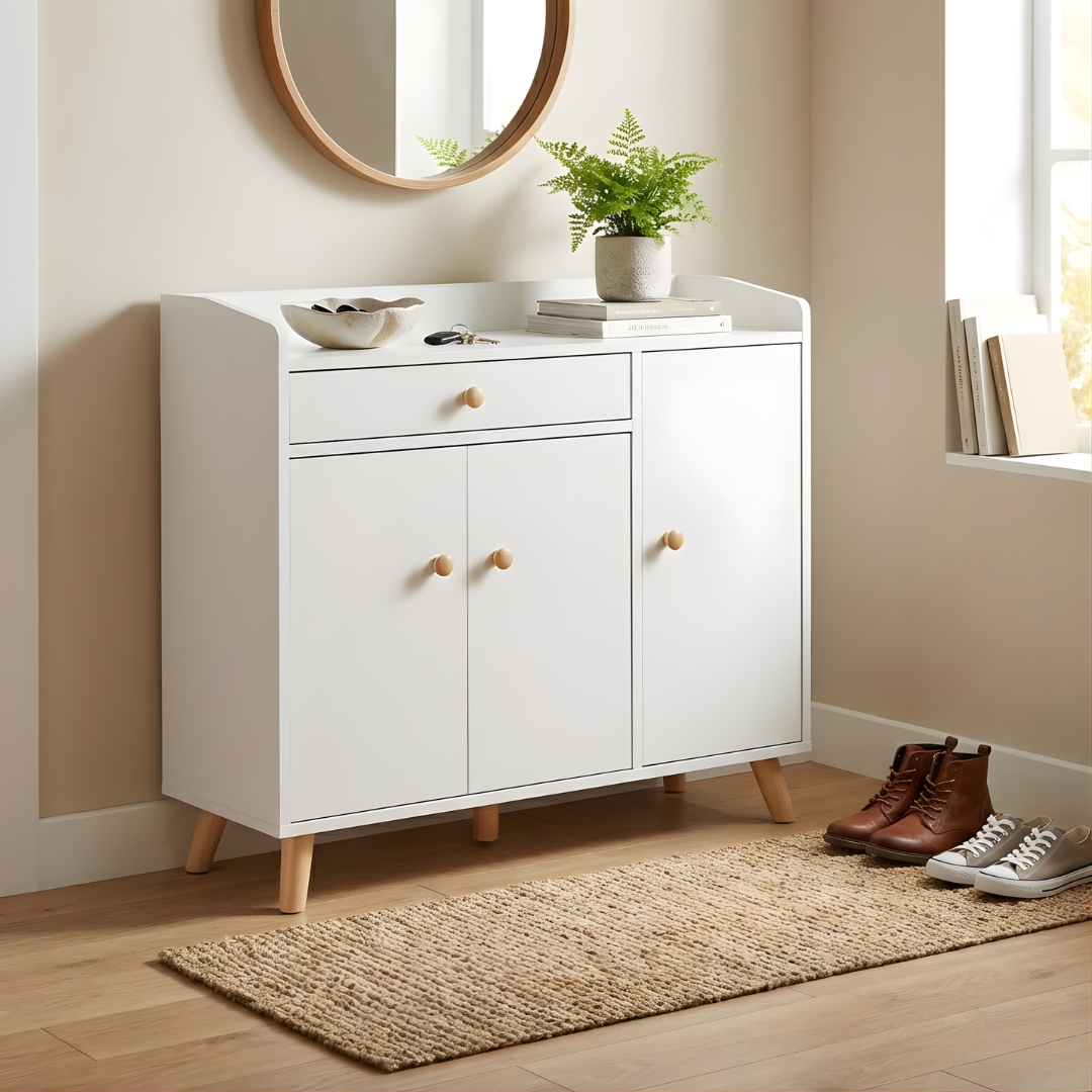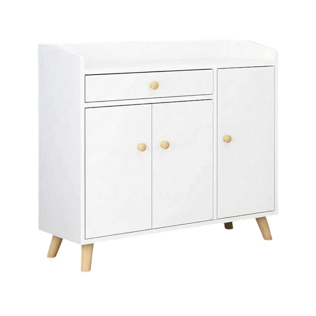 Njegov čisti bijeli dizajn s toplim drvenim detaljima i nogicama unosi eleganciju u prostor, dok pametno raspoređeni pretinci osiguravaju maksimalnu funkcionalnost.
