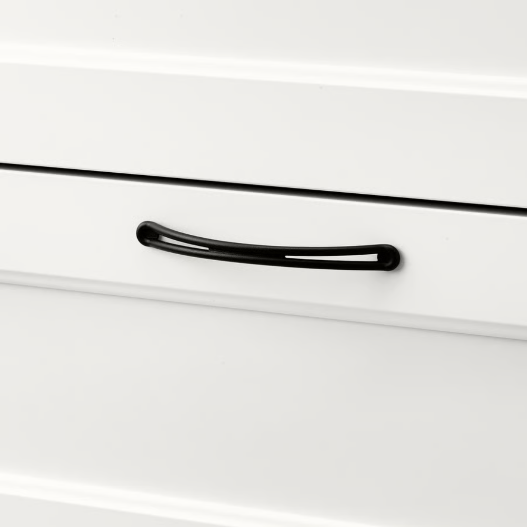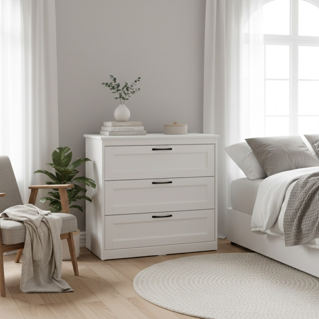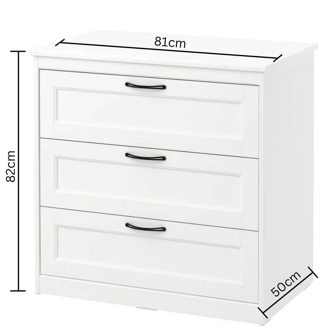 Ova komoda je esencijalni dio namještaja za spavaću sobu, garderobu ili dječju sobu. Idealna je kao komoda s tri ladice, klasična komoda ili ormarić s crnim ručkama.